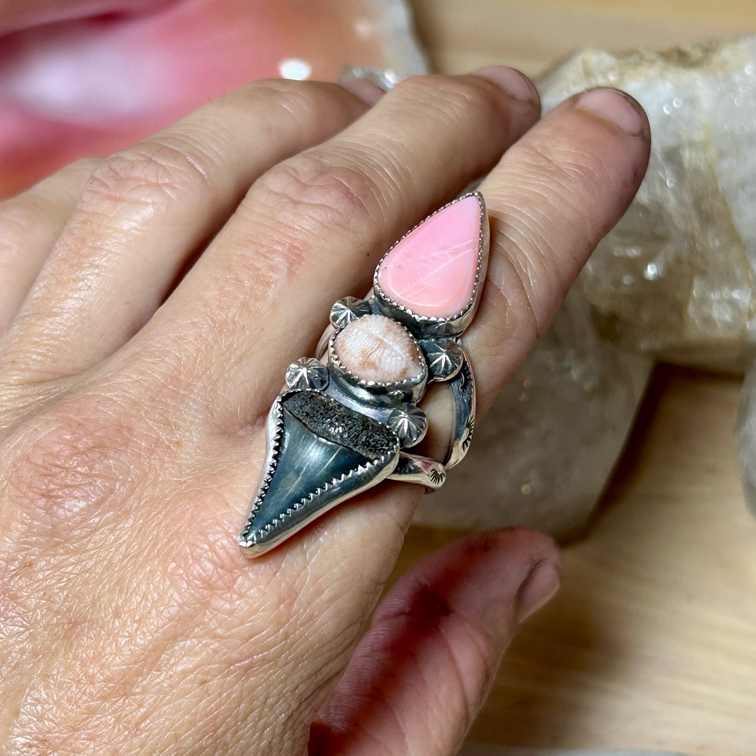 Abalone, Opal, Turquoise, Conch and Shark Tooth Ring Size 7