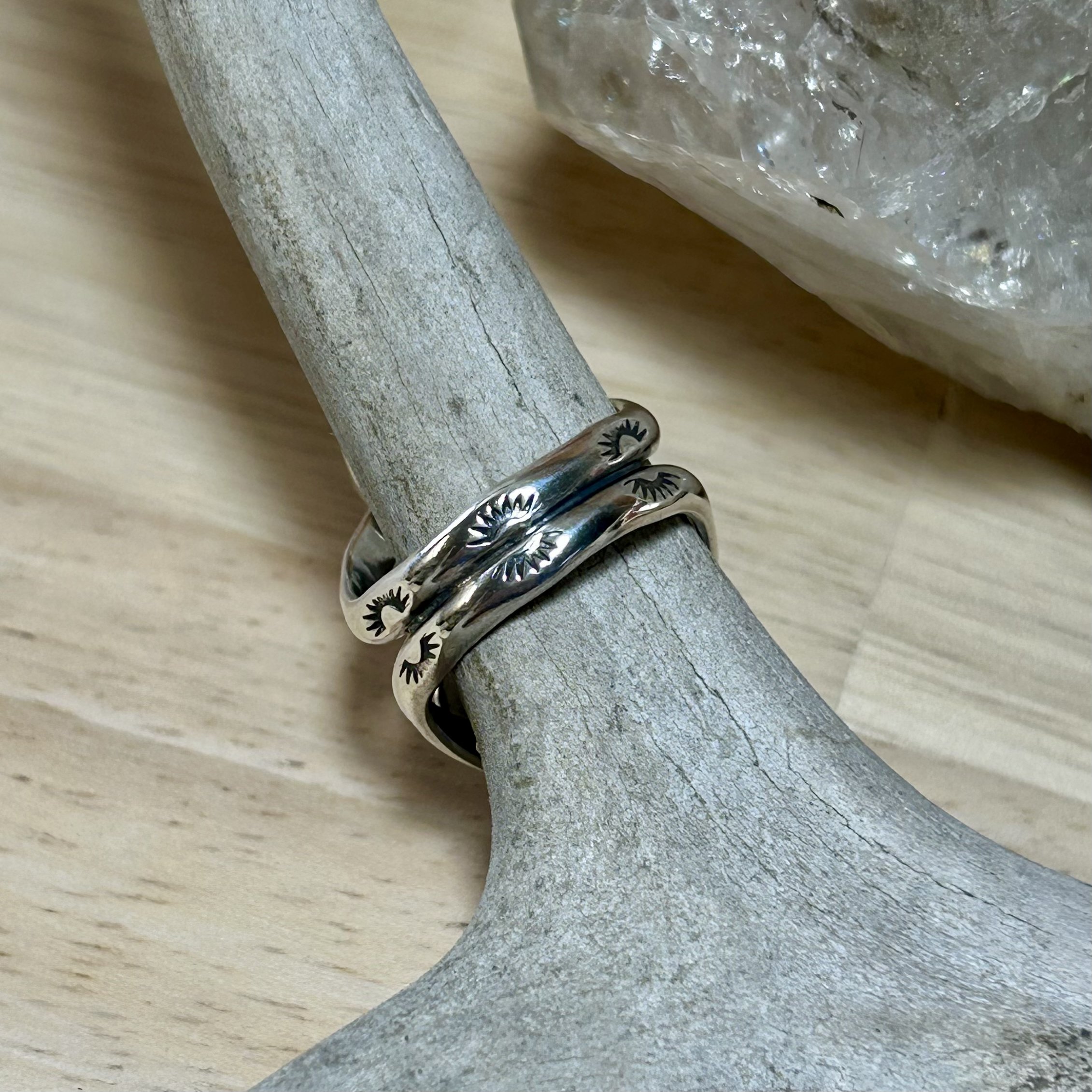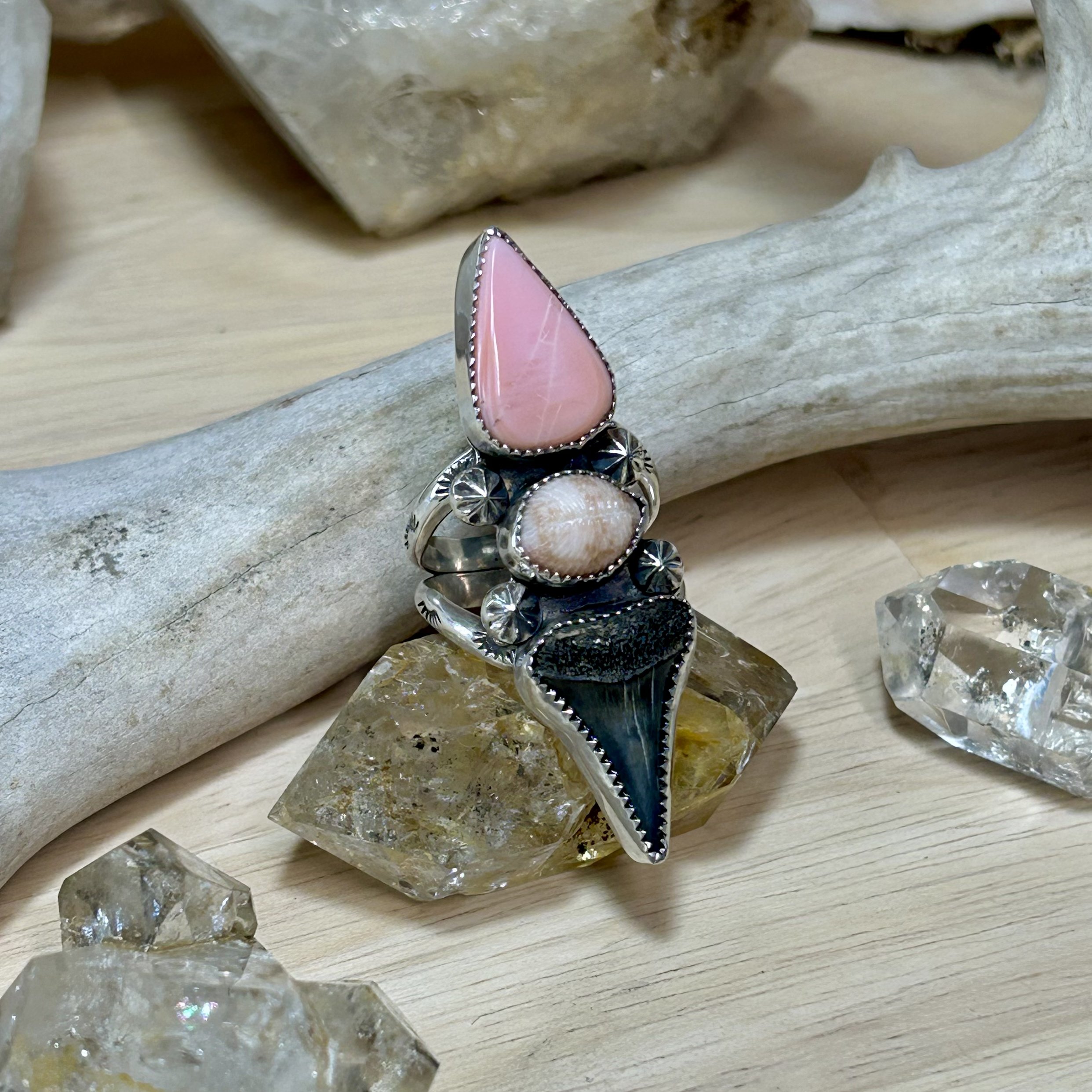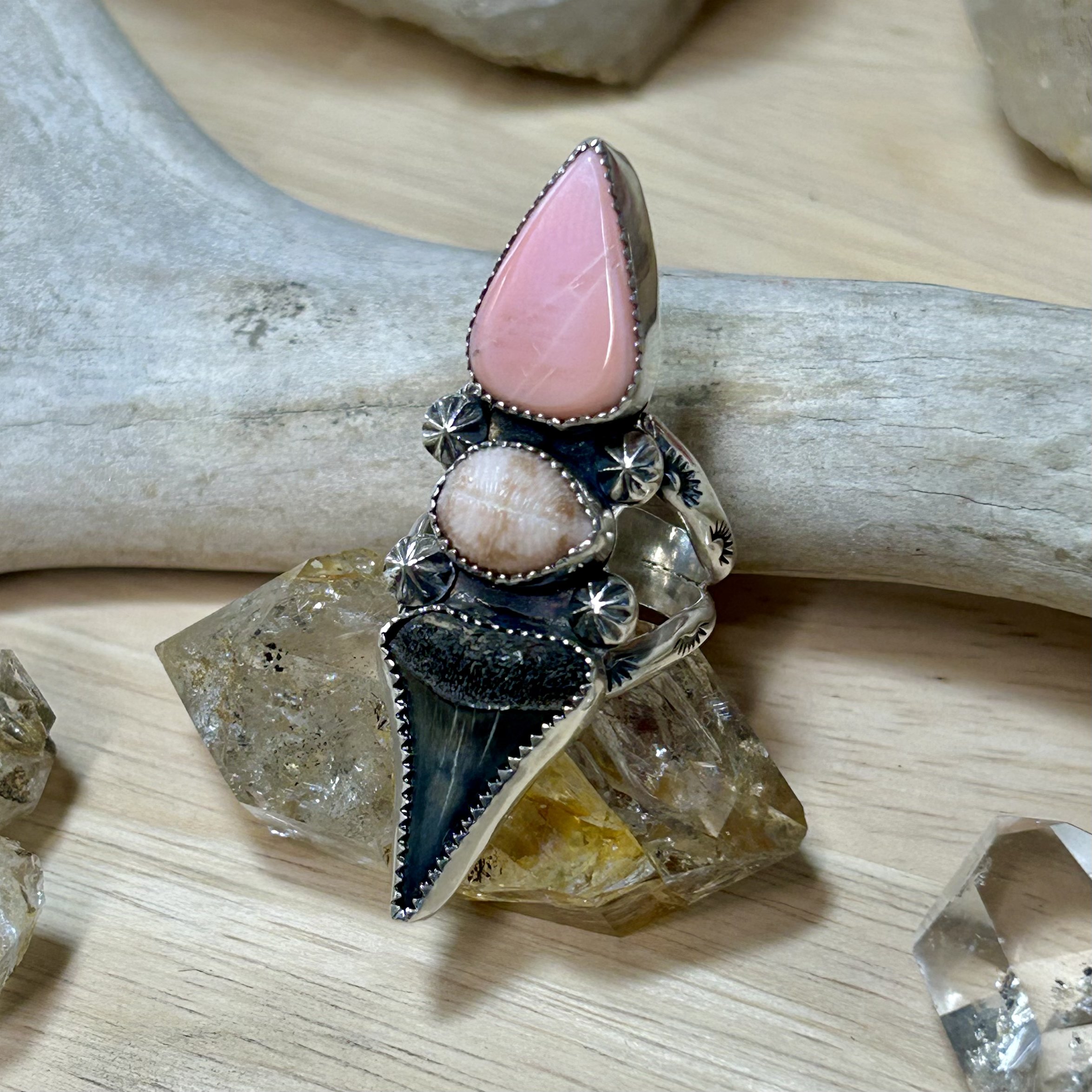 This incredible statement ring is entirely handcrafted out of sterling silver. It features a variety of stones including an Abalone Shell, a purple Australian Opal, Turquoise, Bahamian Queen Conch and a fossilized Shark Tooth. All are set in serrated bezels and surrounded by beaded borders. They are flanked by pairs of silver flower details. The band is a triple shank style with stamped details. This one of a kind ring fits a size 7.