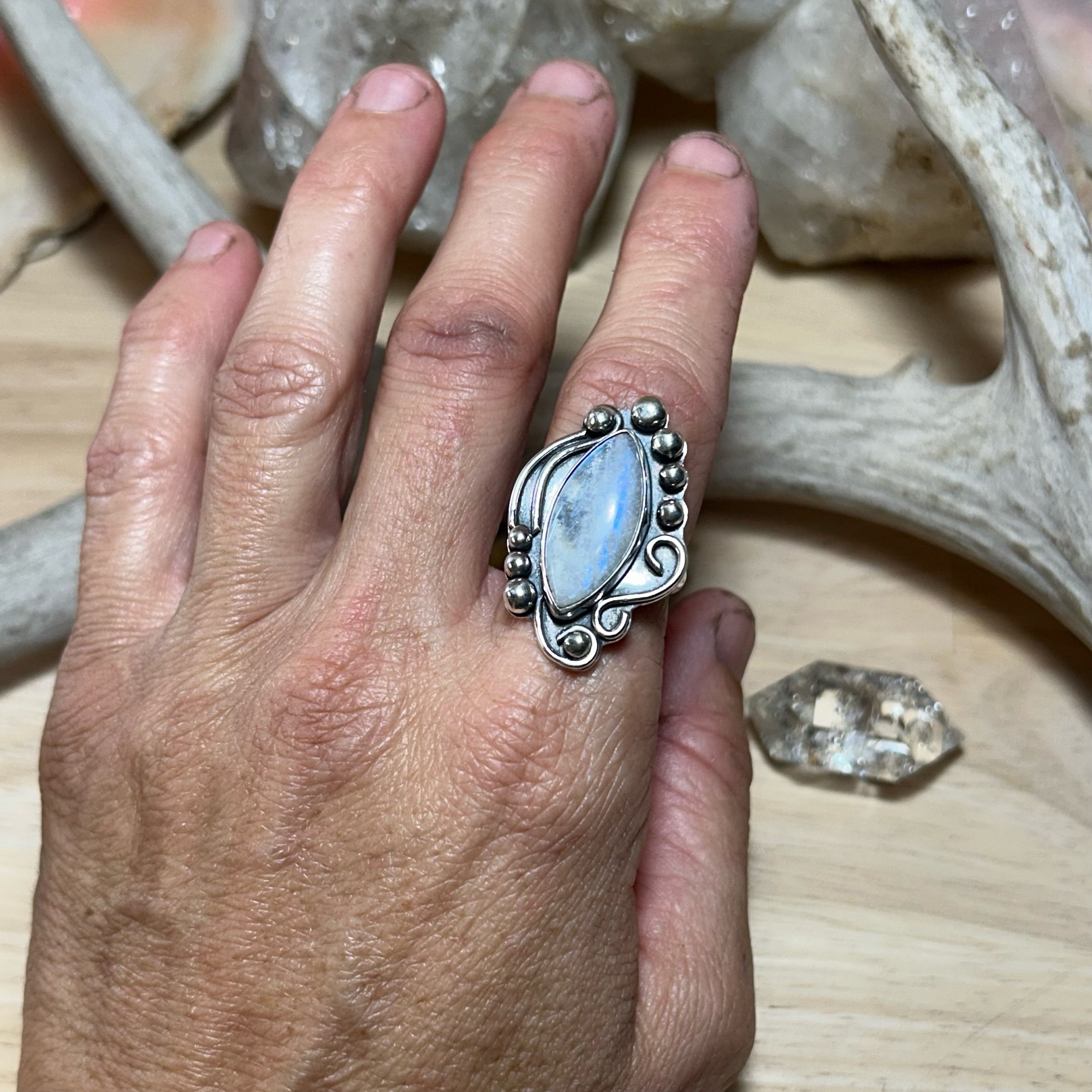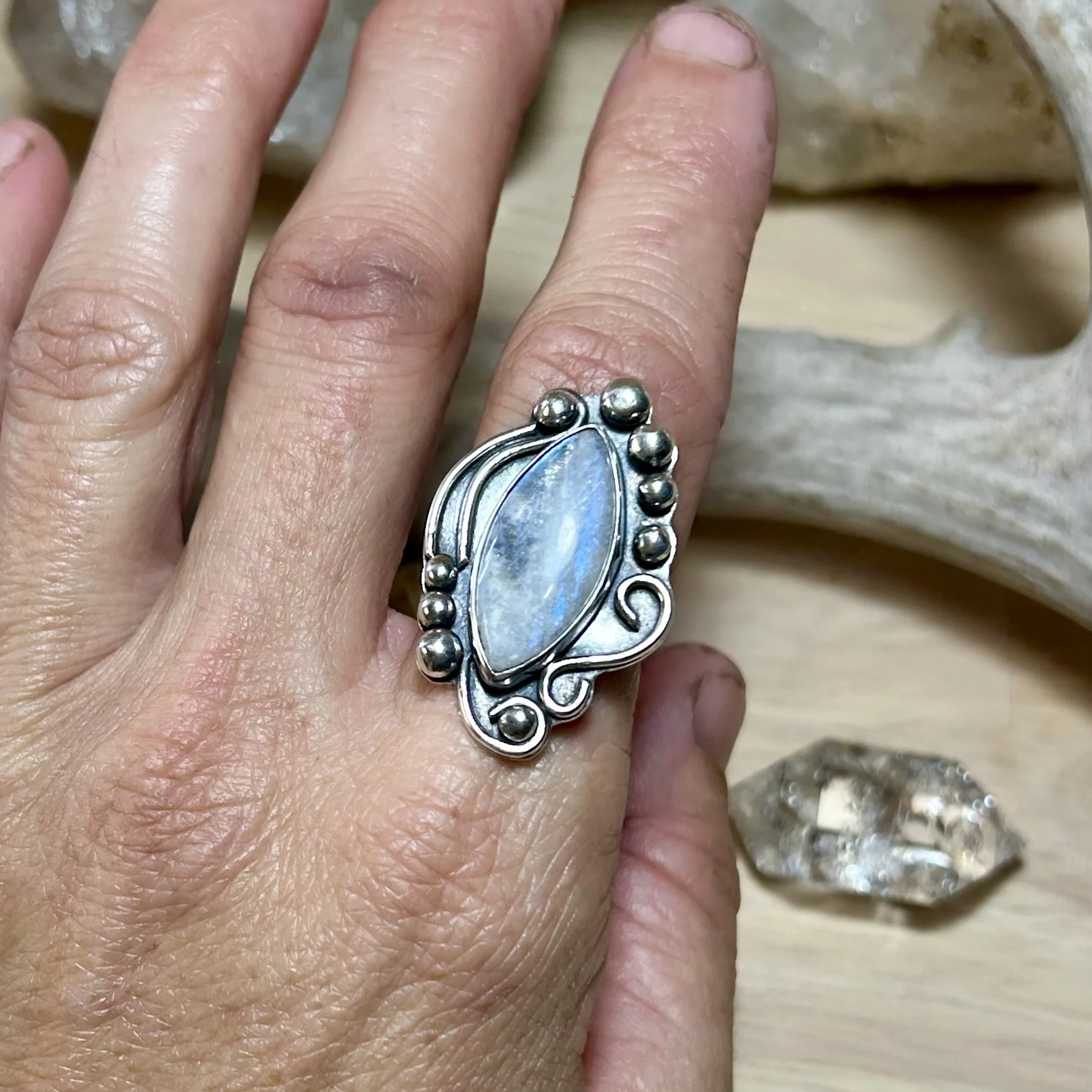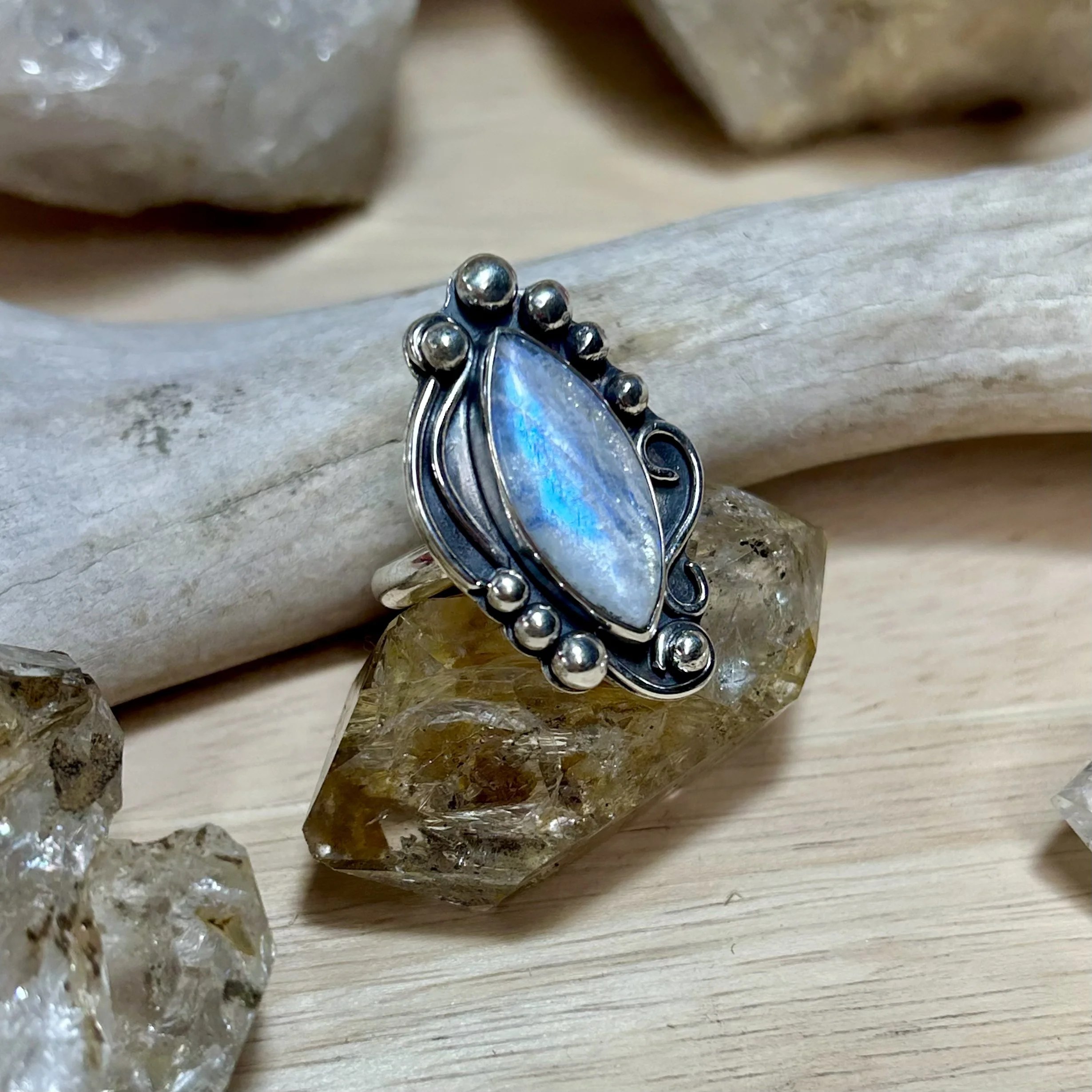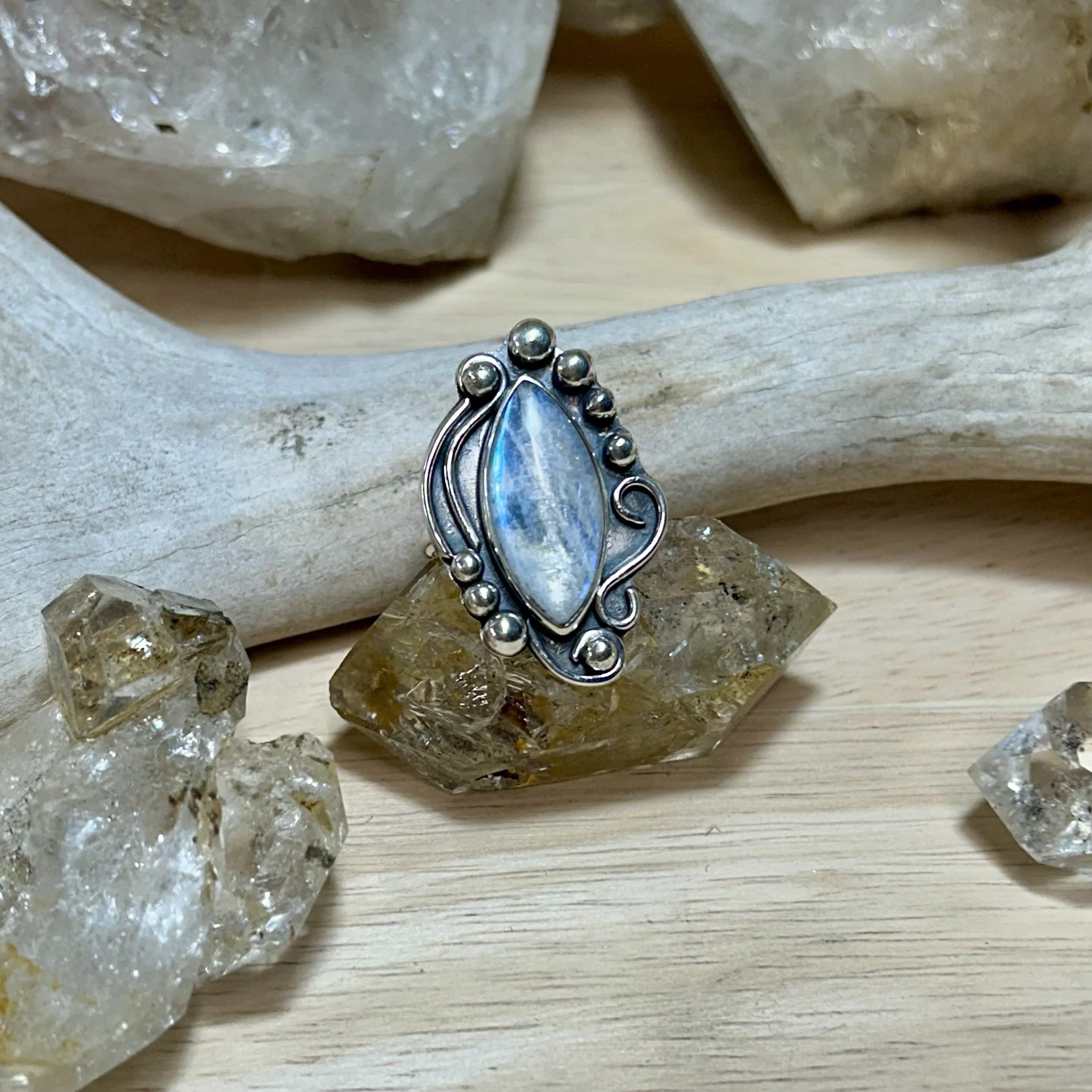 This lovely ring reminds me of winter magic. Featuring a flashy marquise shaped moonstone set in a handcrafted setting with swirly and silver ball details. The ring is entirely made of sterling silver. It fits a size 8.