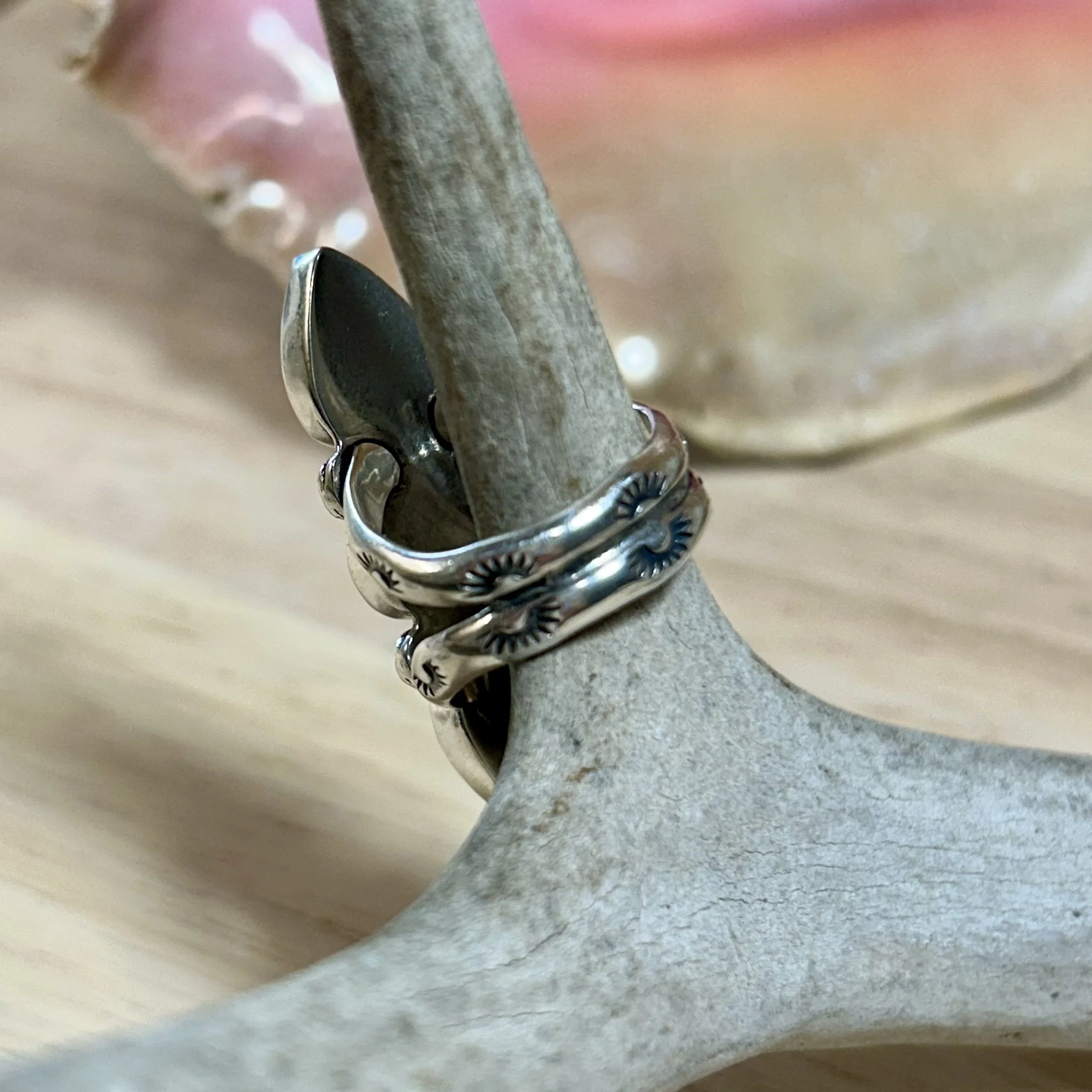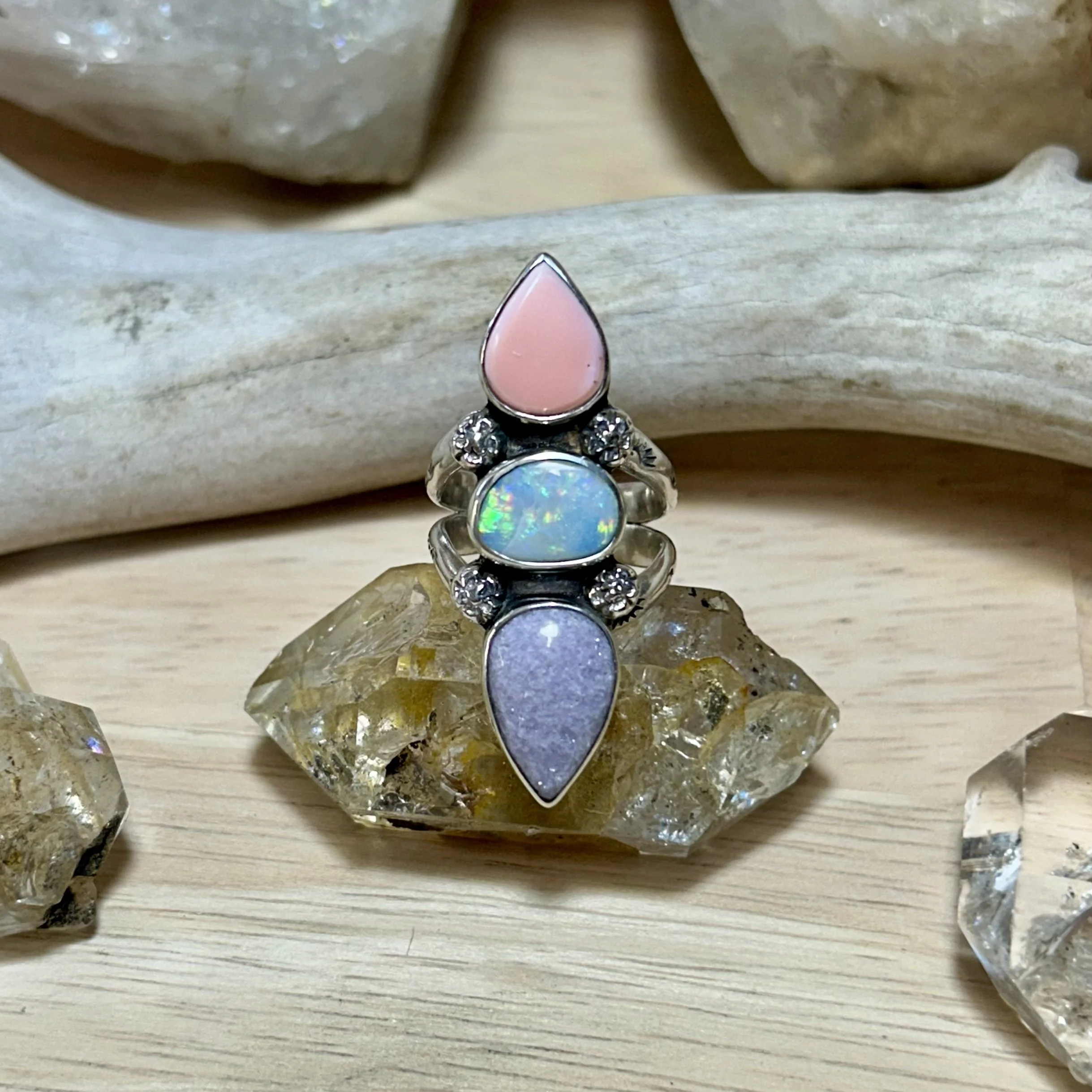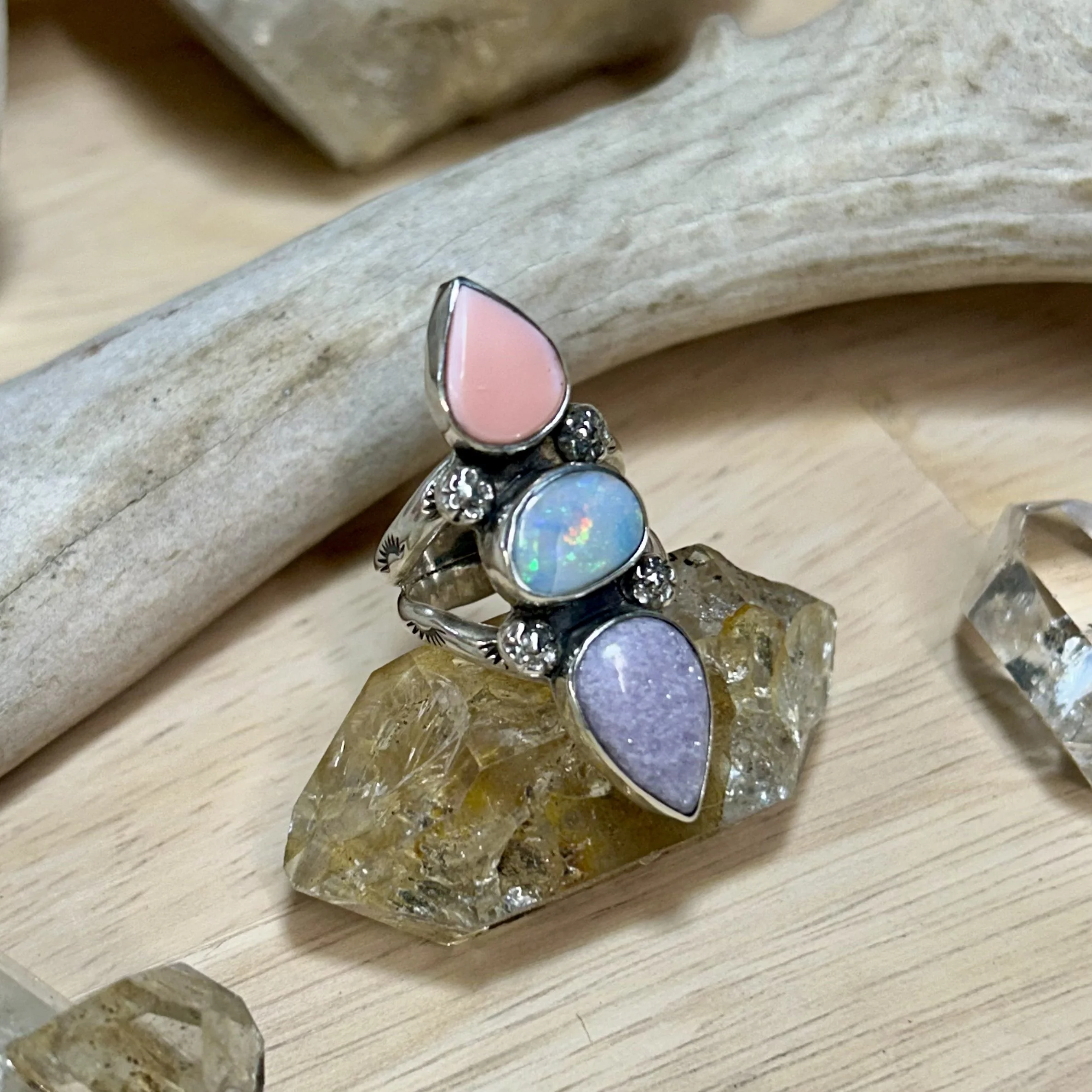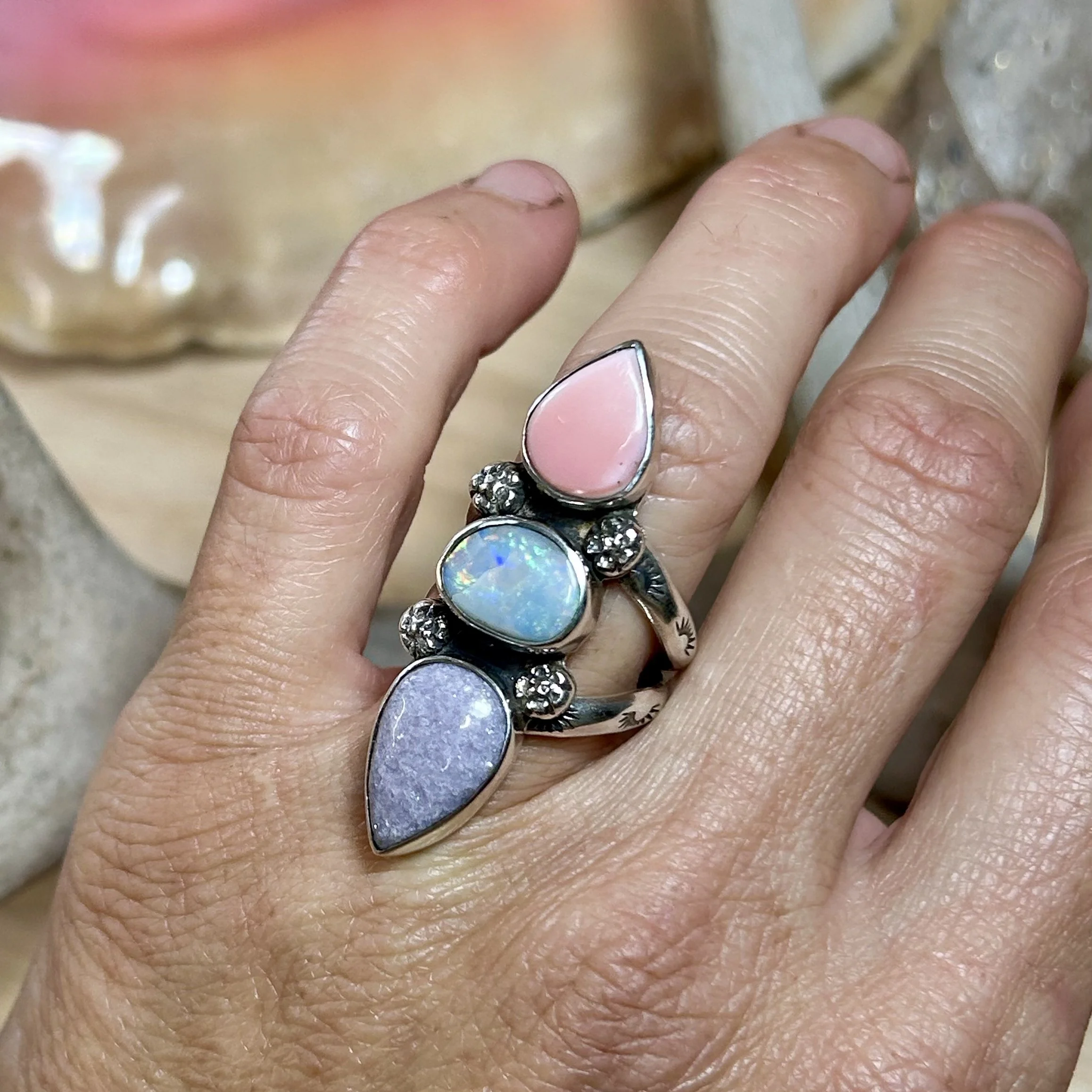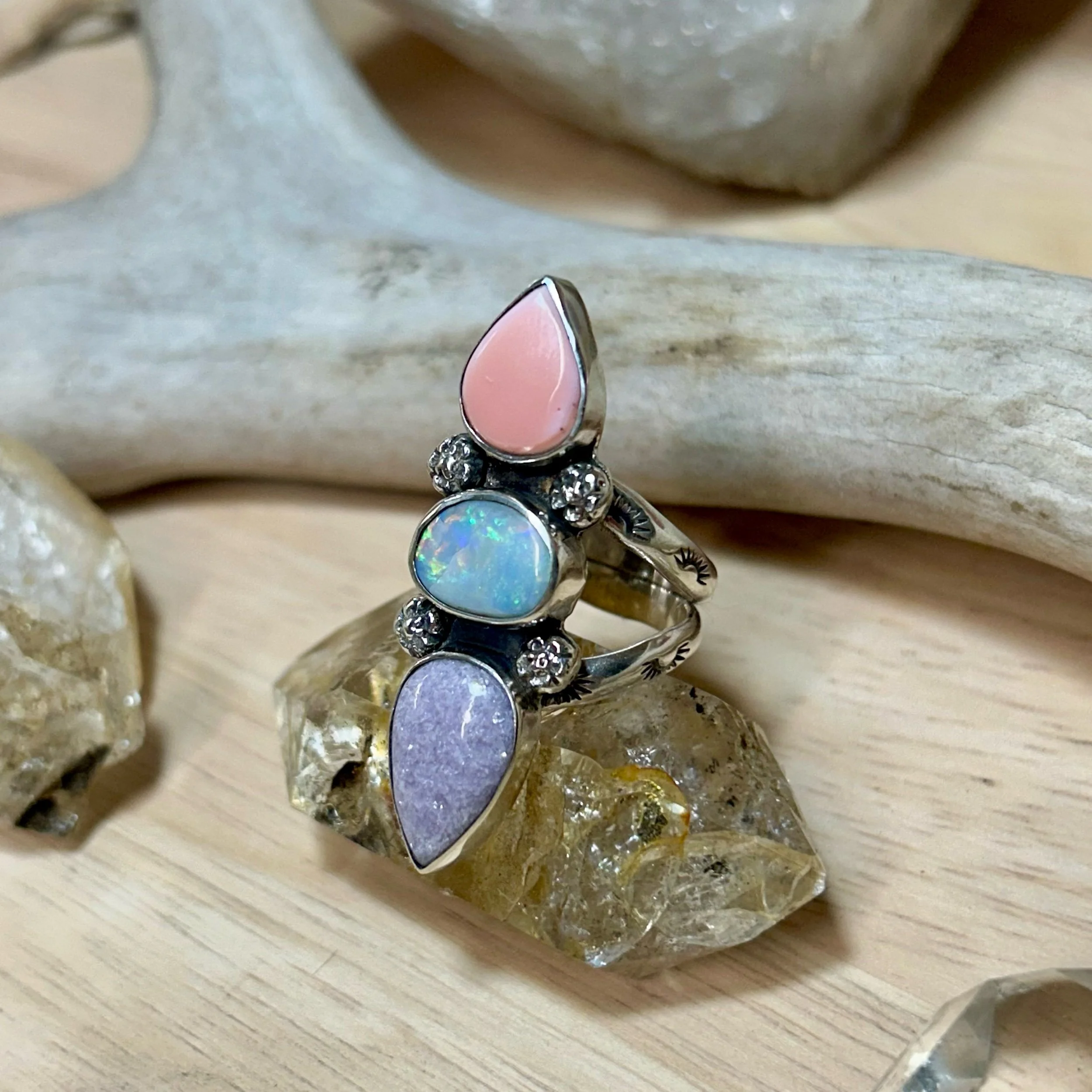 This gorgeous ring is entirely handcrafted out of sterling silver. It features a handcut Bahamian Queen Conch Shell, a fiery Australian Opal, and a sparkly purple Lepidolite. All are set in smooth bezels and flanked by silver flower details. Please note that the opal has an internal line that runs through it. It is not a crack. It is a beautiful colorful gem regardless. The ring band is a double shank with rising sun stamping on it. It fits a size 7.
