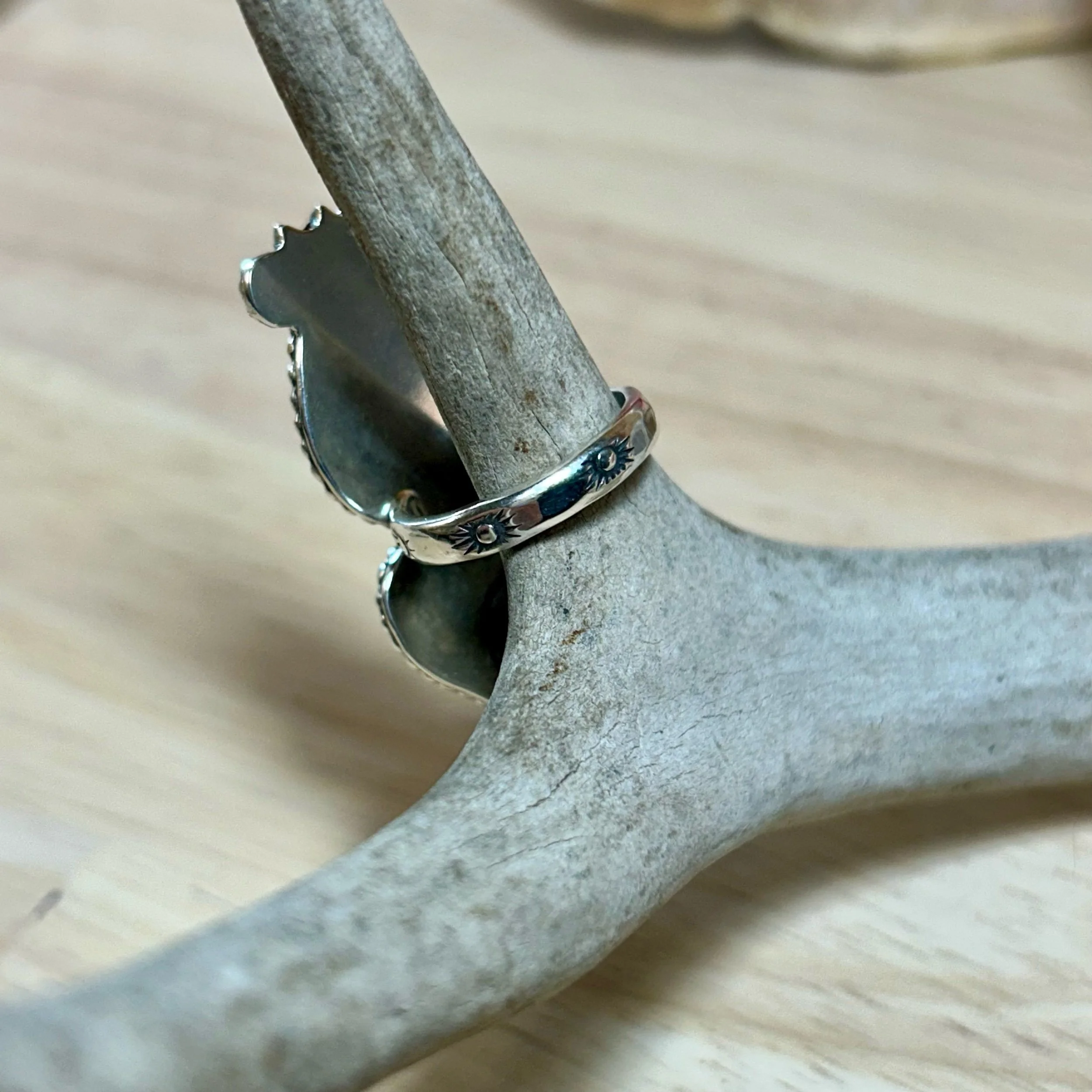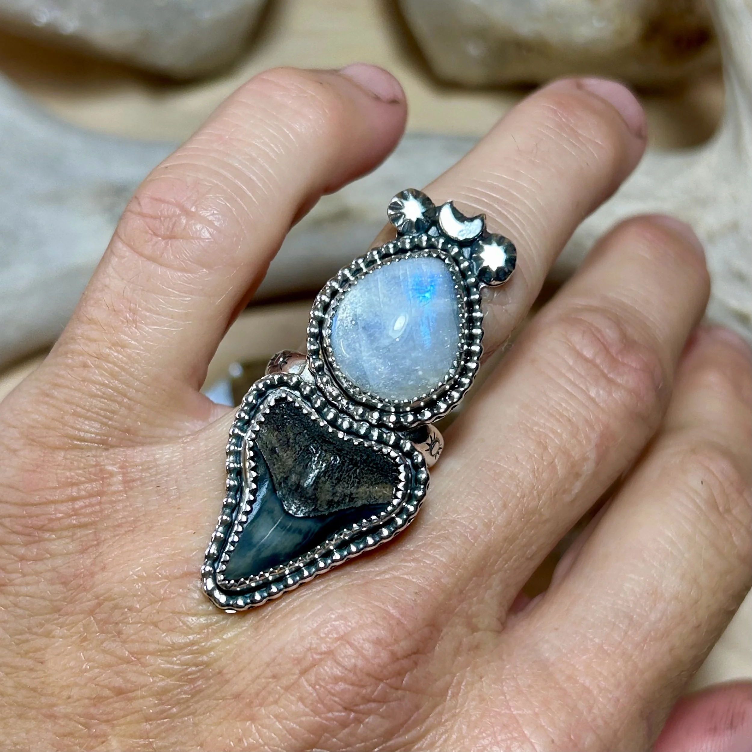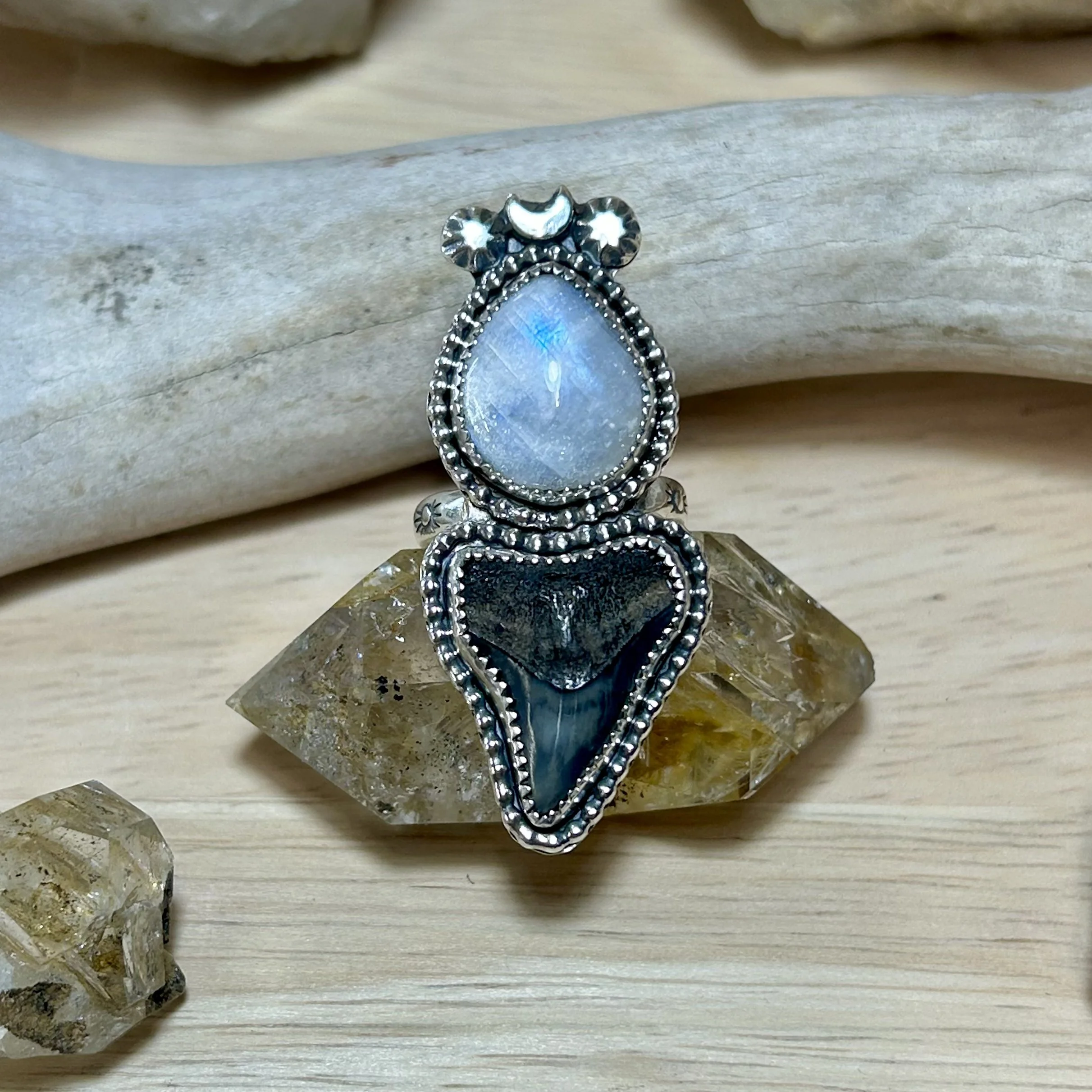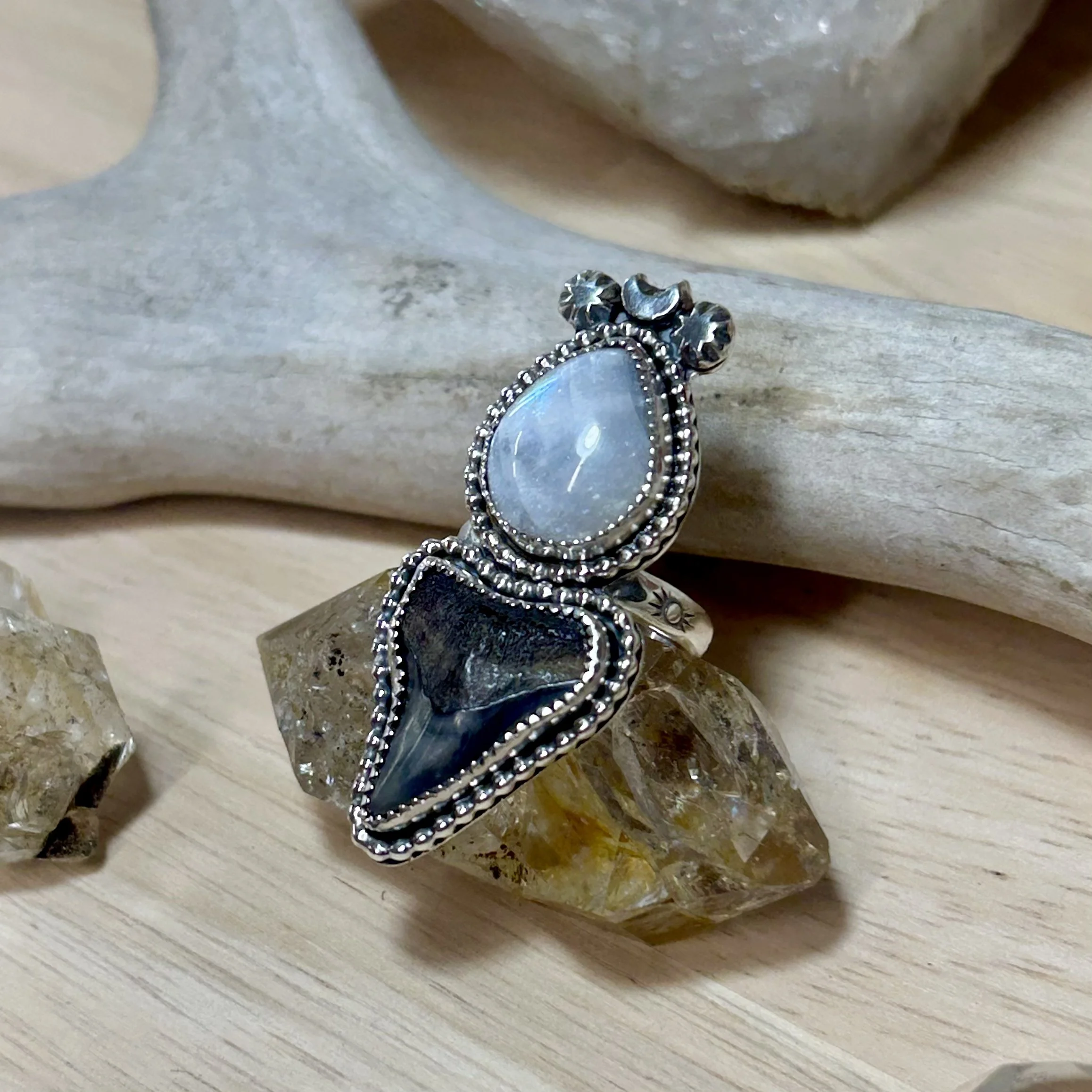 This magical ring is entirely handcrafted out of sterling silver. It features a flashy moonstone paired with a fossilized shark tooth. Both are set in serrated bezels, surrounded by a beaded border and topped with silver stars and moon details. The ring band is stamped with a sun motif and fits a size 6.5.