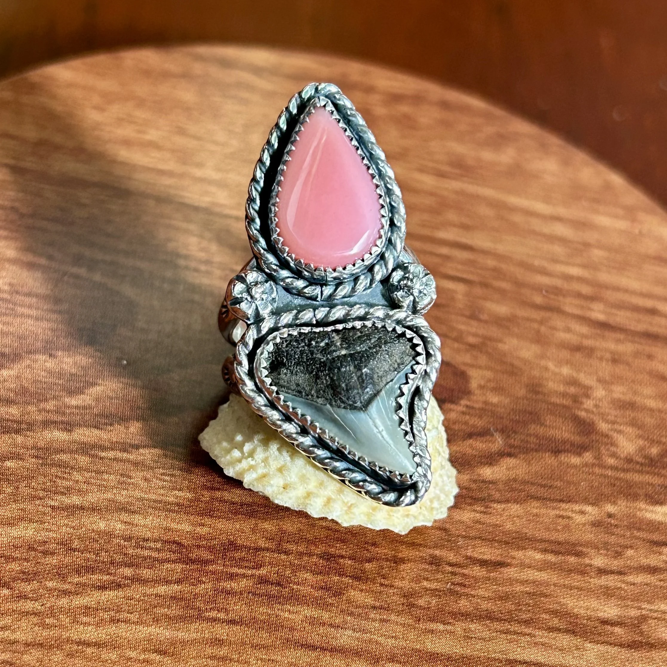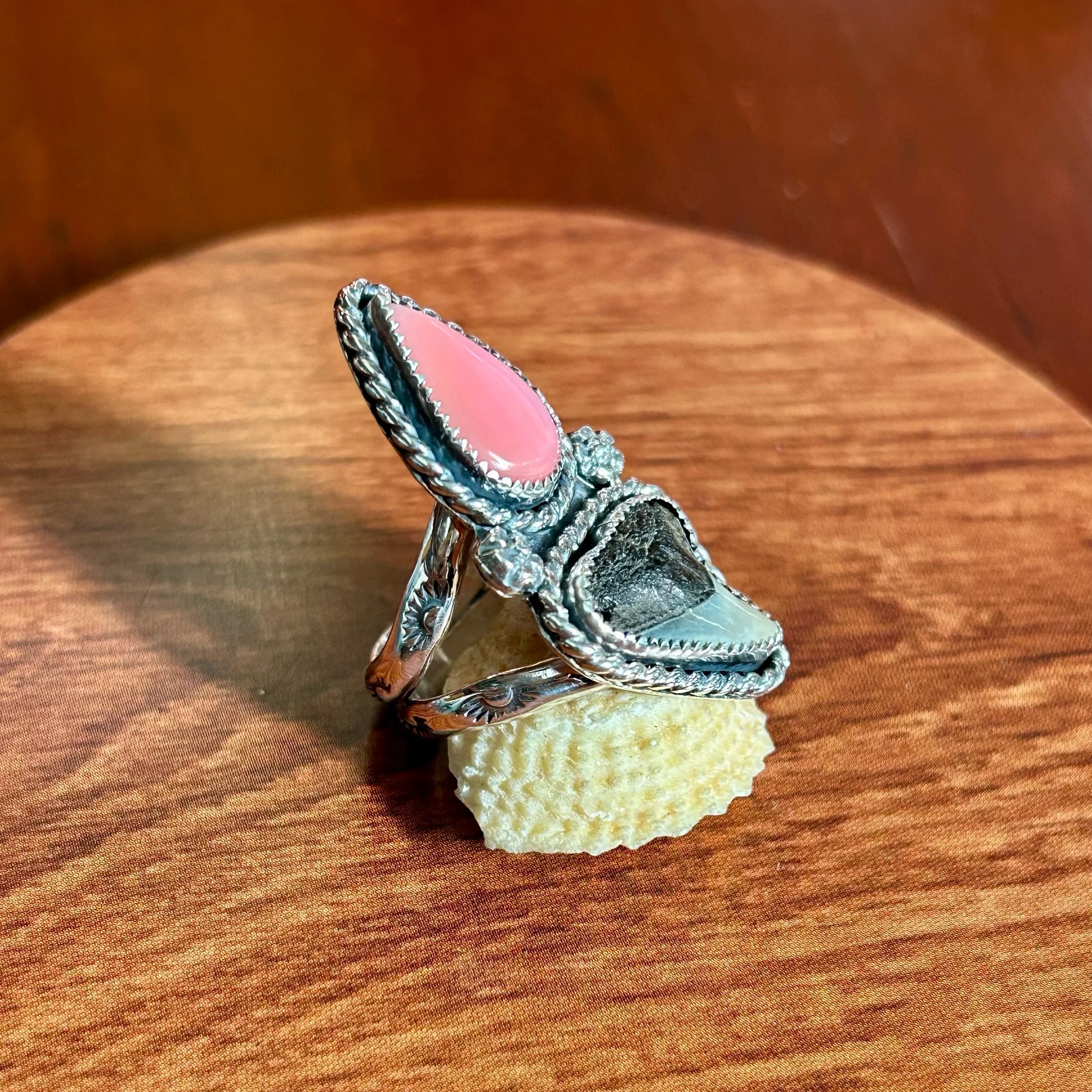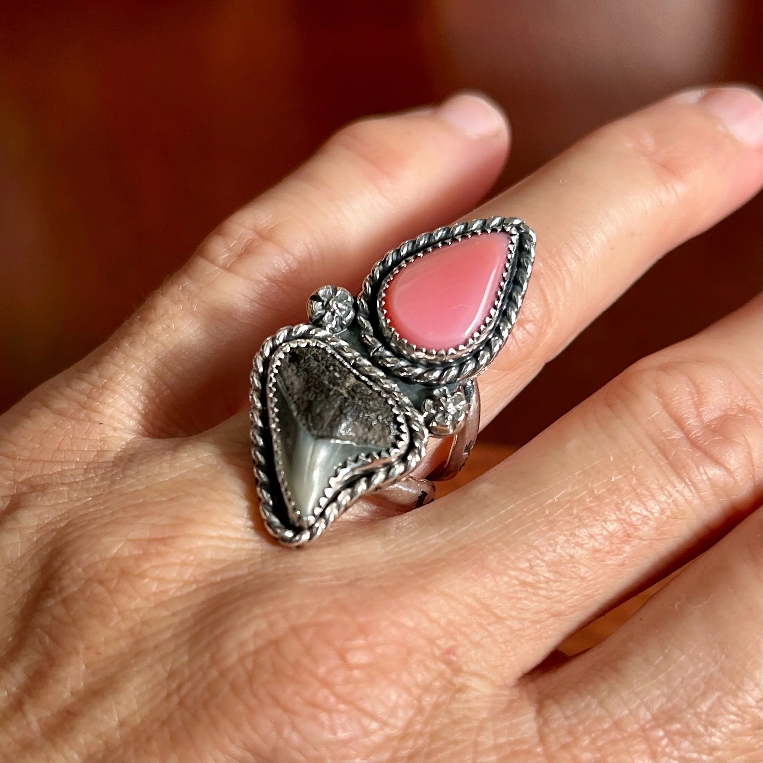 This lovely ring is entirely handcrafted out of sterling silver and features a beautiful handcut Bahamian Queen Conch, Turquoise, Abalone Shell and a Florida Fossilized Shark Tooth. All three are set in serrated bezels, surrounded by a twisted rope border and flanked by silver concha star details. The band is a triple shank style with stamped details and fits a size 8.5
