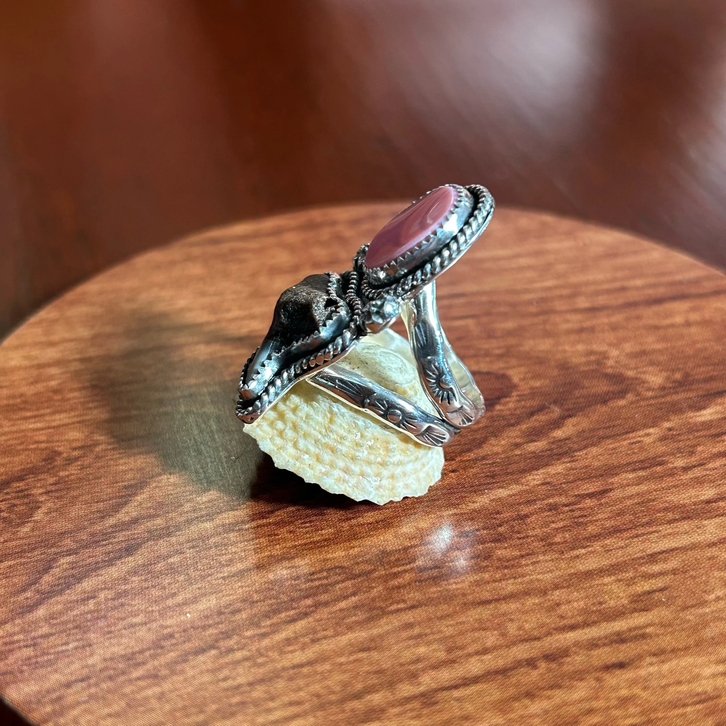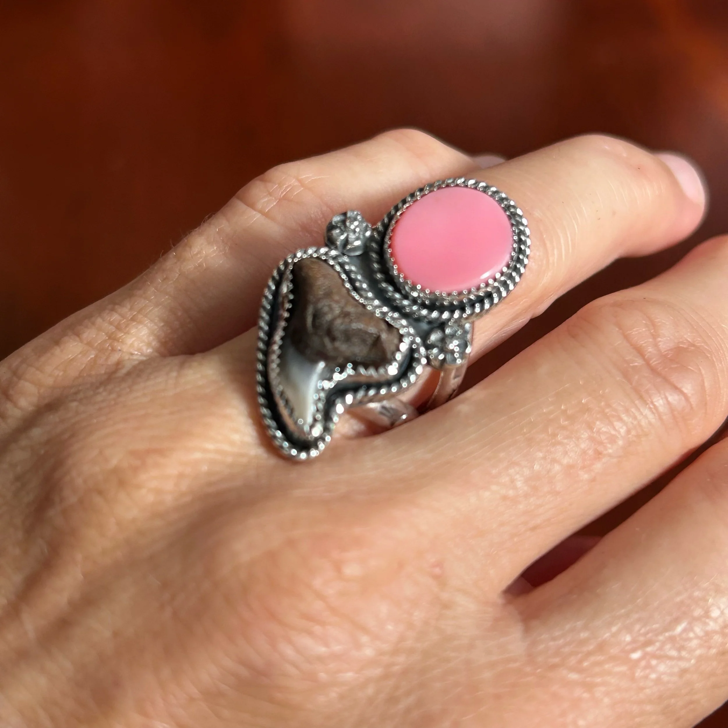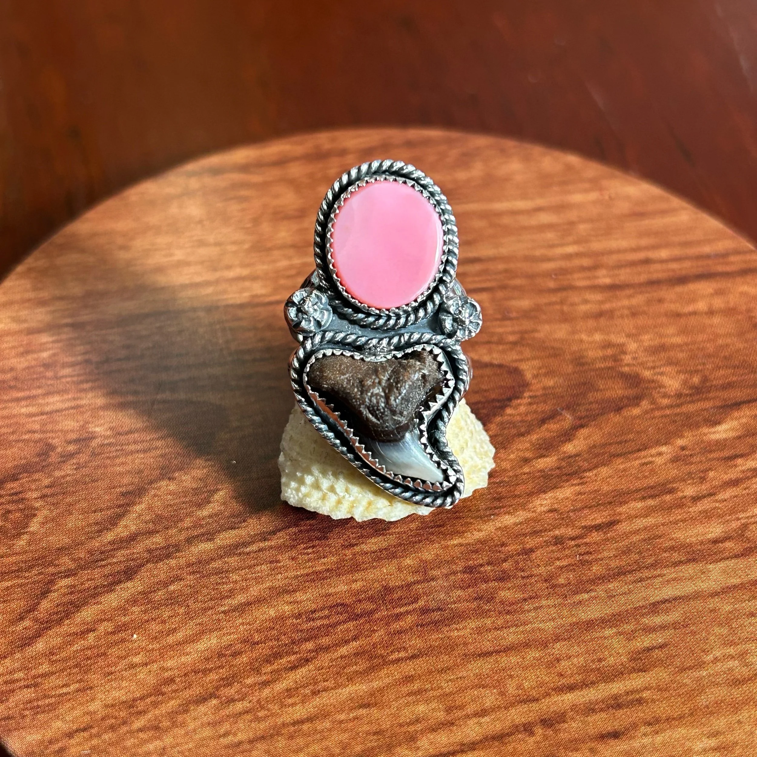 This lovely ring is entirely handcrafted out of sterling silver and features a beautiful handcut Bahamian Queen Conch, Turquoise, Abalone Shell and a Florida Fossilized Shark Tooth. All three are set in serrated bezels, surrounded by a twisted rope border and flanked by silver concha star details. The band is a triple shank style with stamped details and fits a size 8.5