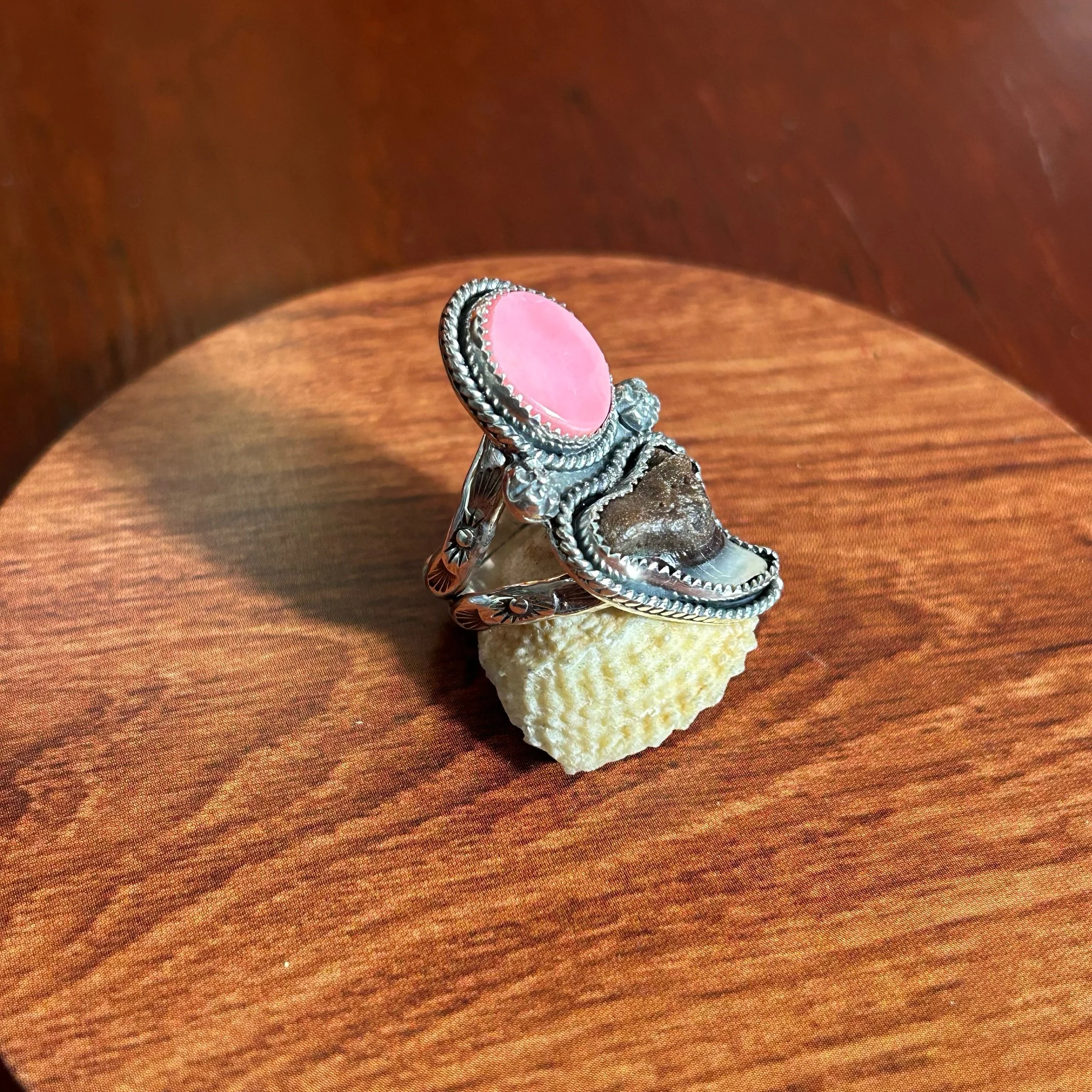 Conch, Turquoise. Abalone and Shark Tooth Ring Size 8.5