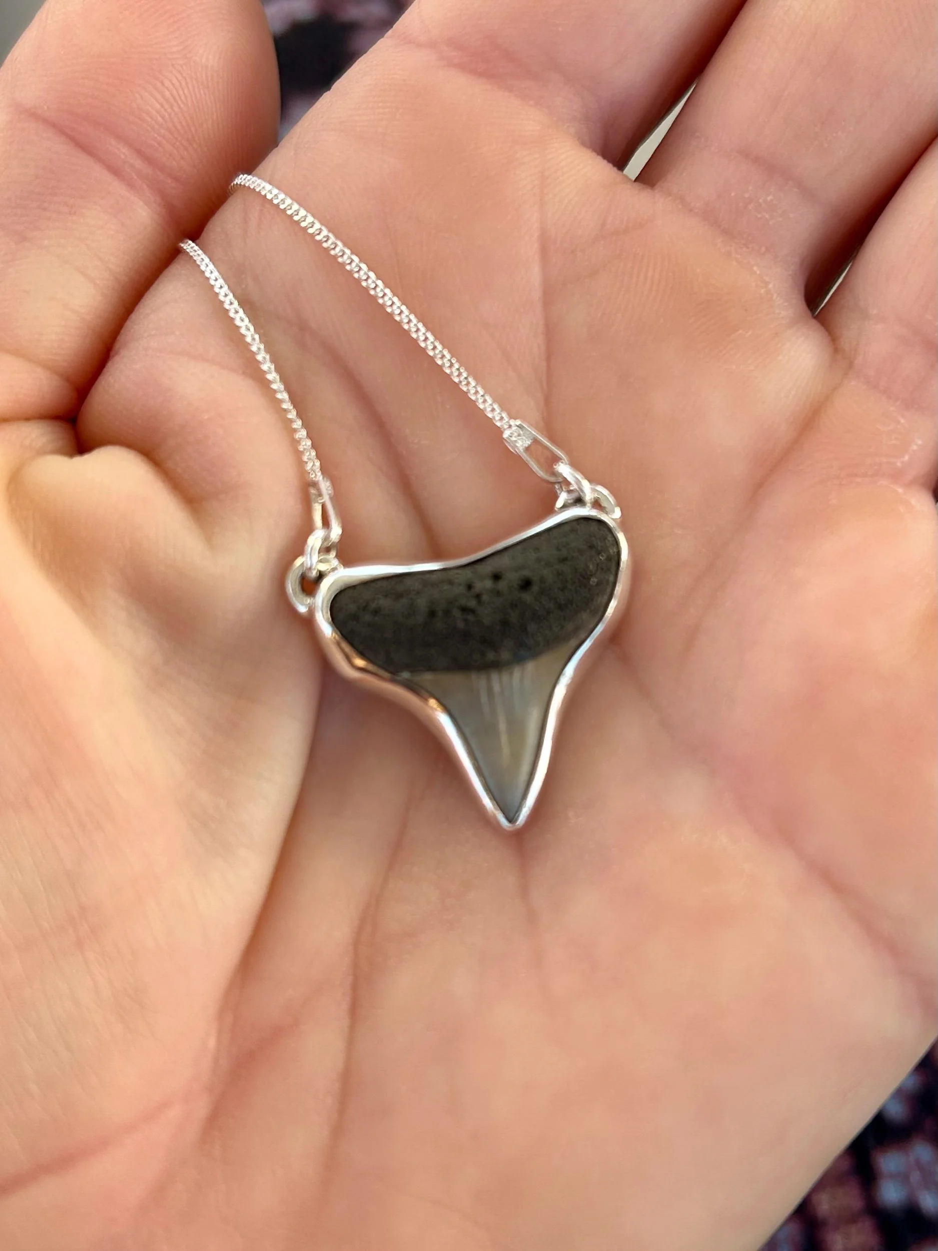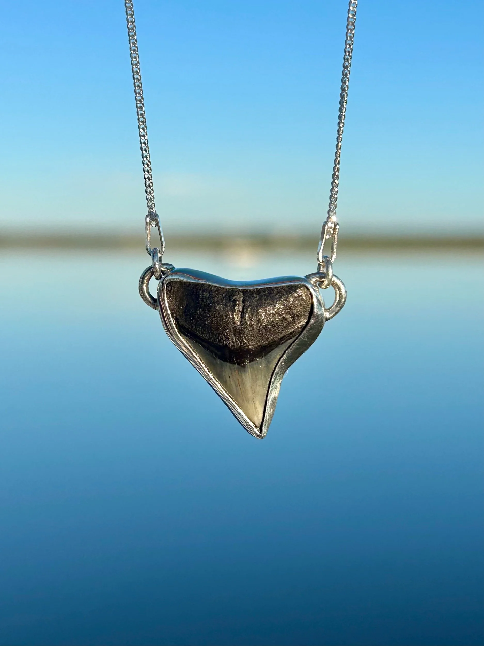 Handcrafted out of sterling silver this Fossilized Shark Tooth is set in a sleek bezel setting and hangs from an adjustable sterling silver chain. Tooth measures .8” long.