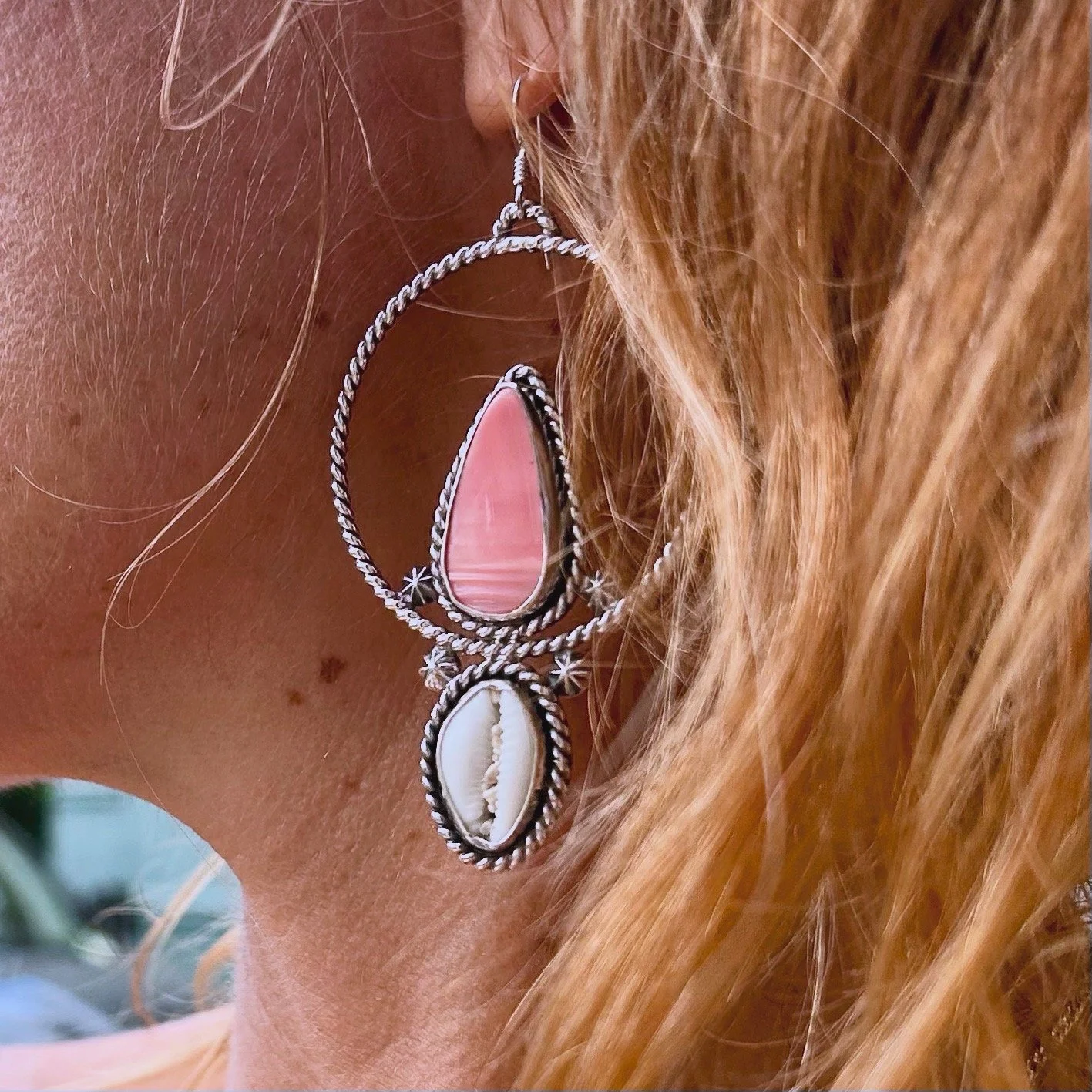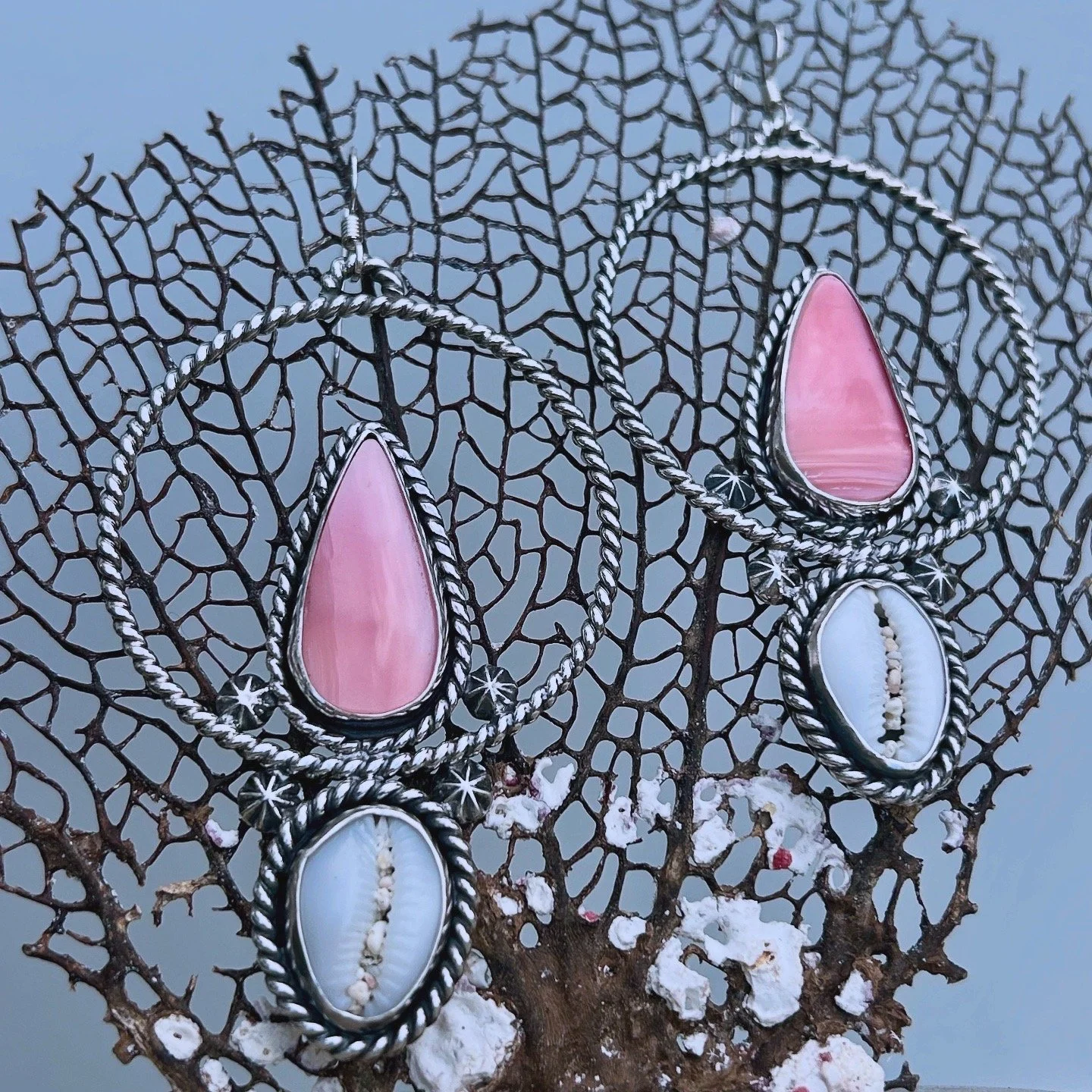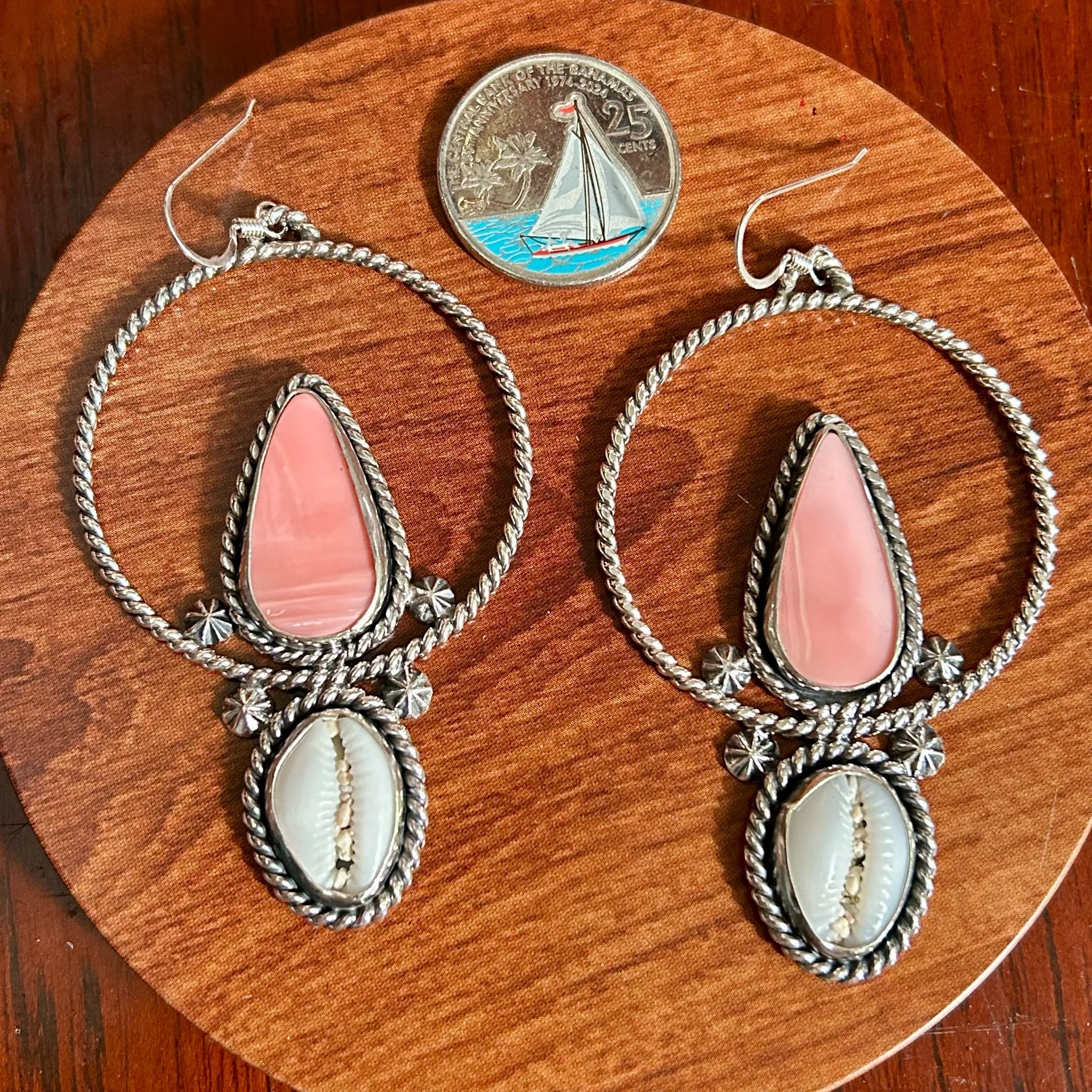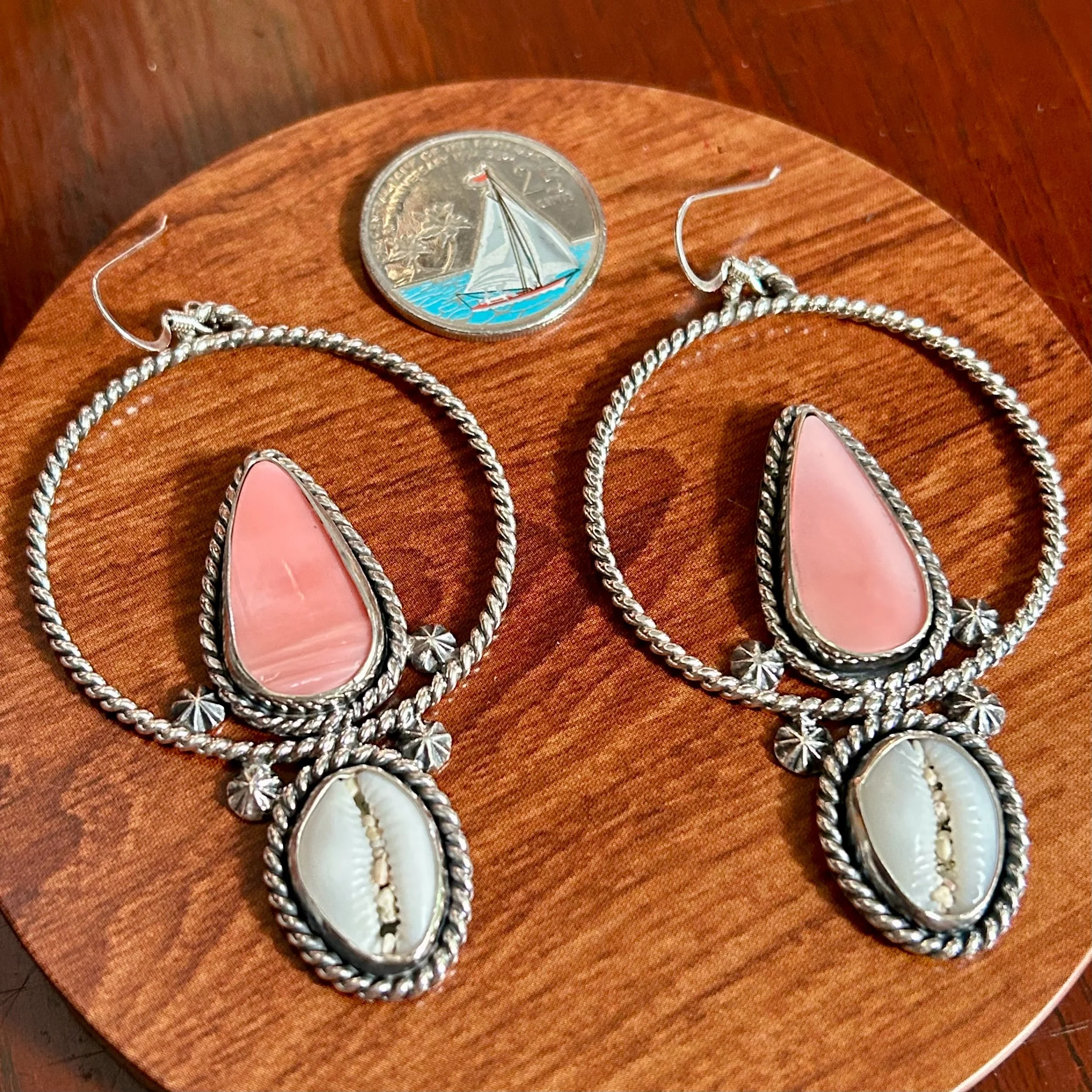 These gorgeous earrings are entirely handcrafted out of sterling silver. They feature handcut Bahamian Conch Shell, Turquoise and Fossilized Shark Teeth. The hang from sterling silver ear hooks. The first photo shows their relative size compared to a Bahamian Quarter which is roughly the same size as a US Quarter.
