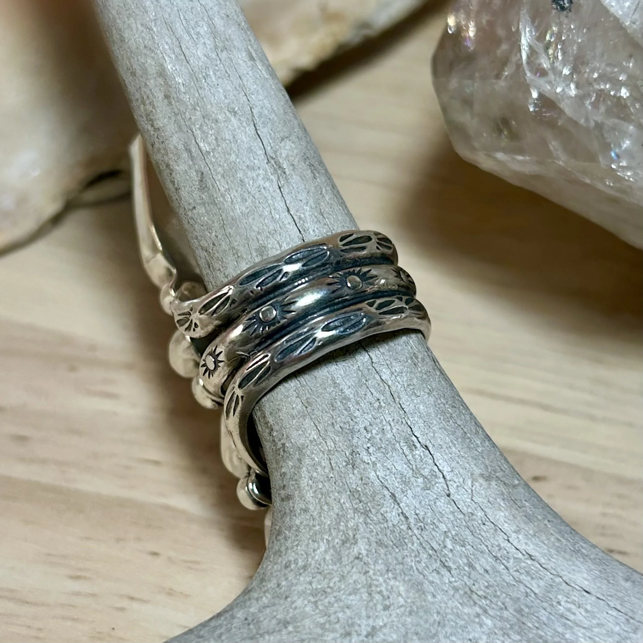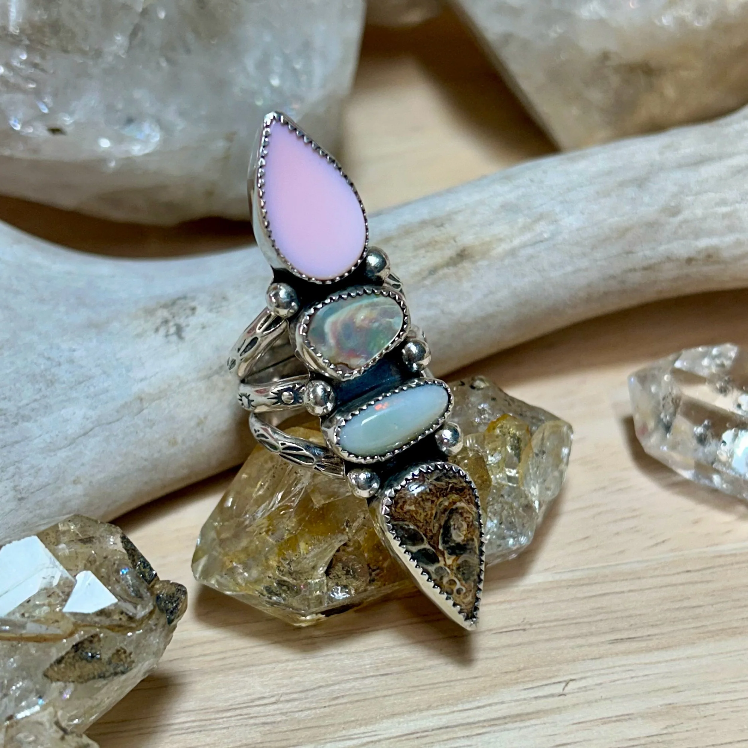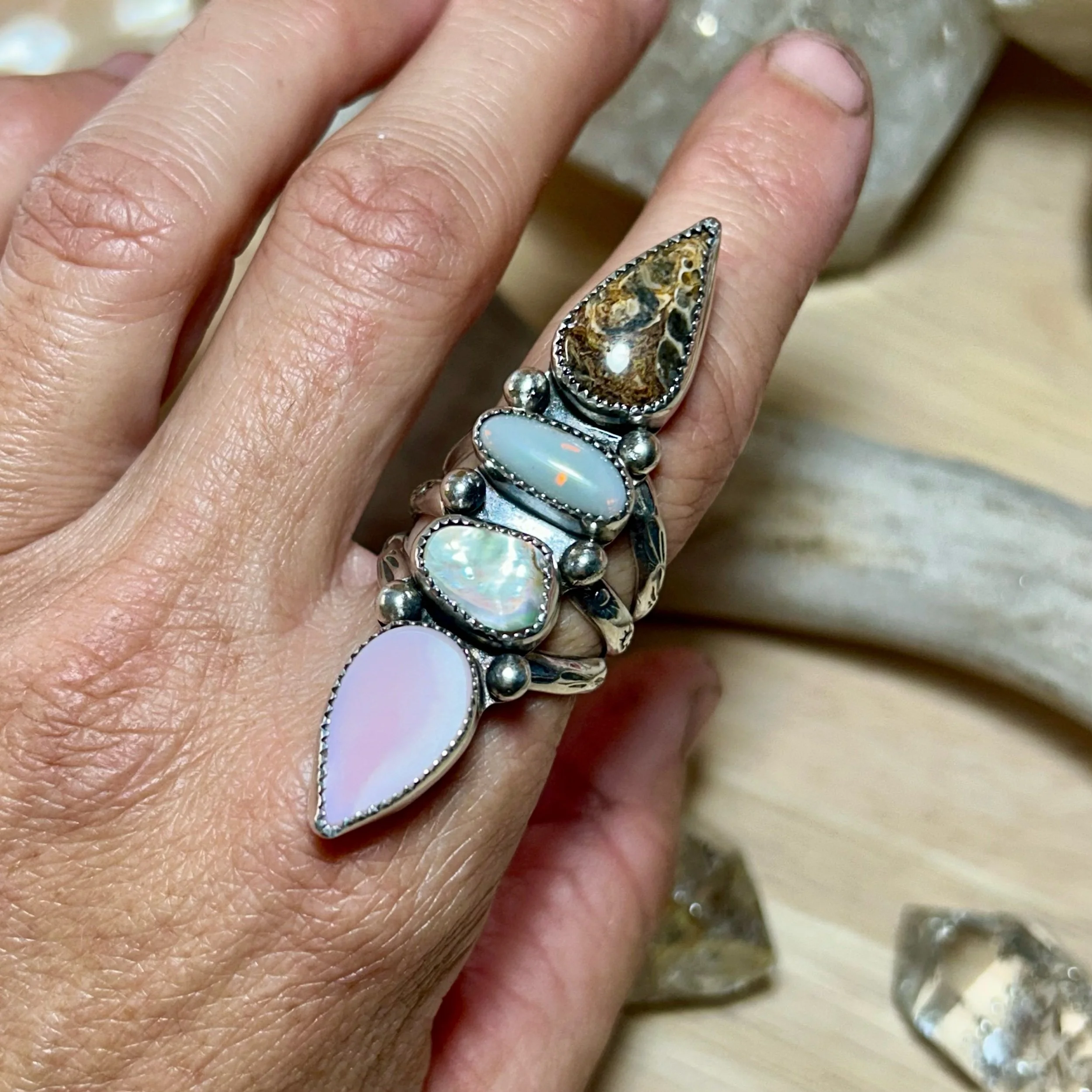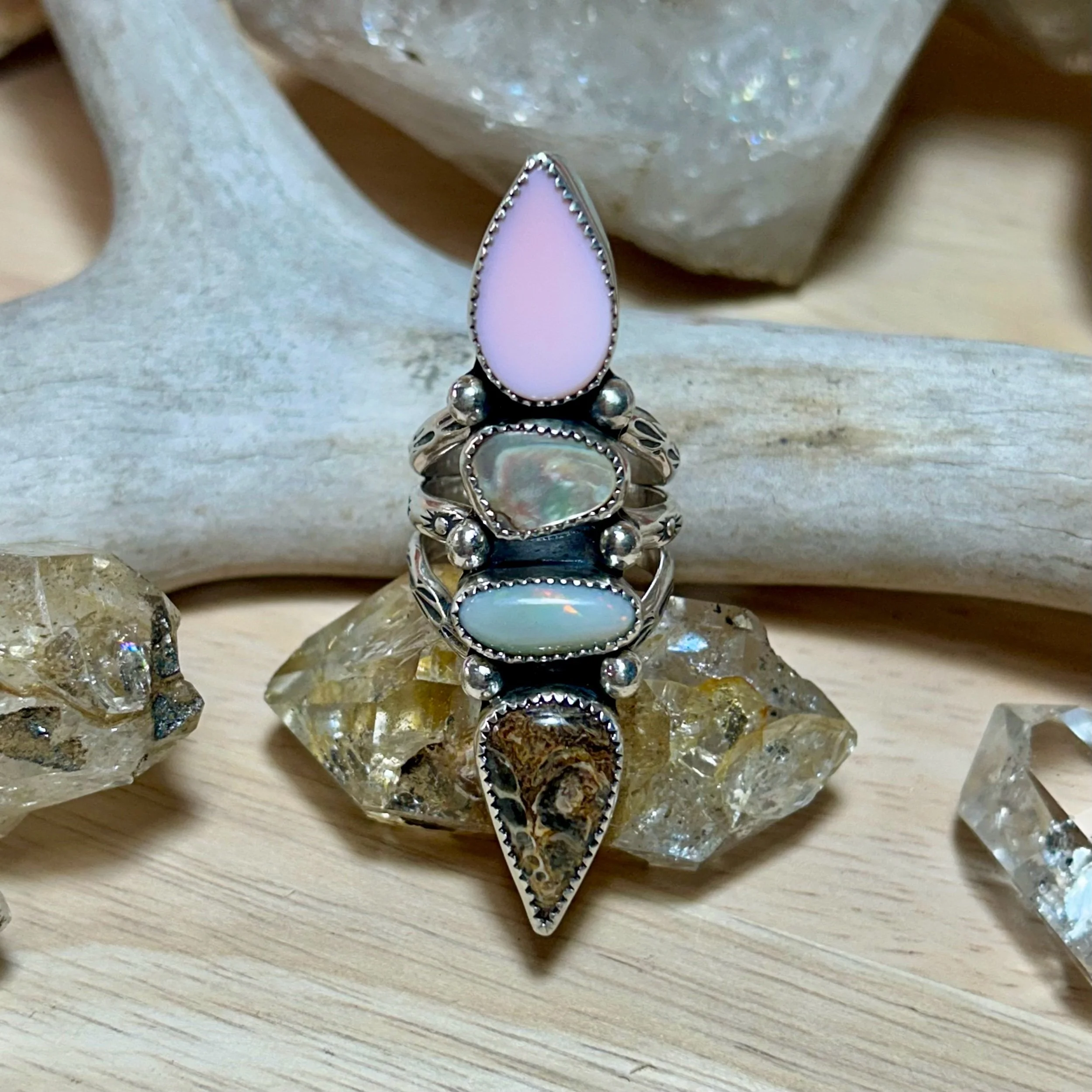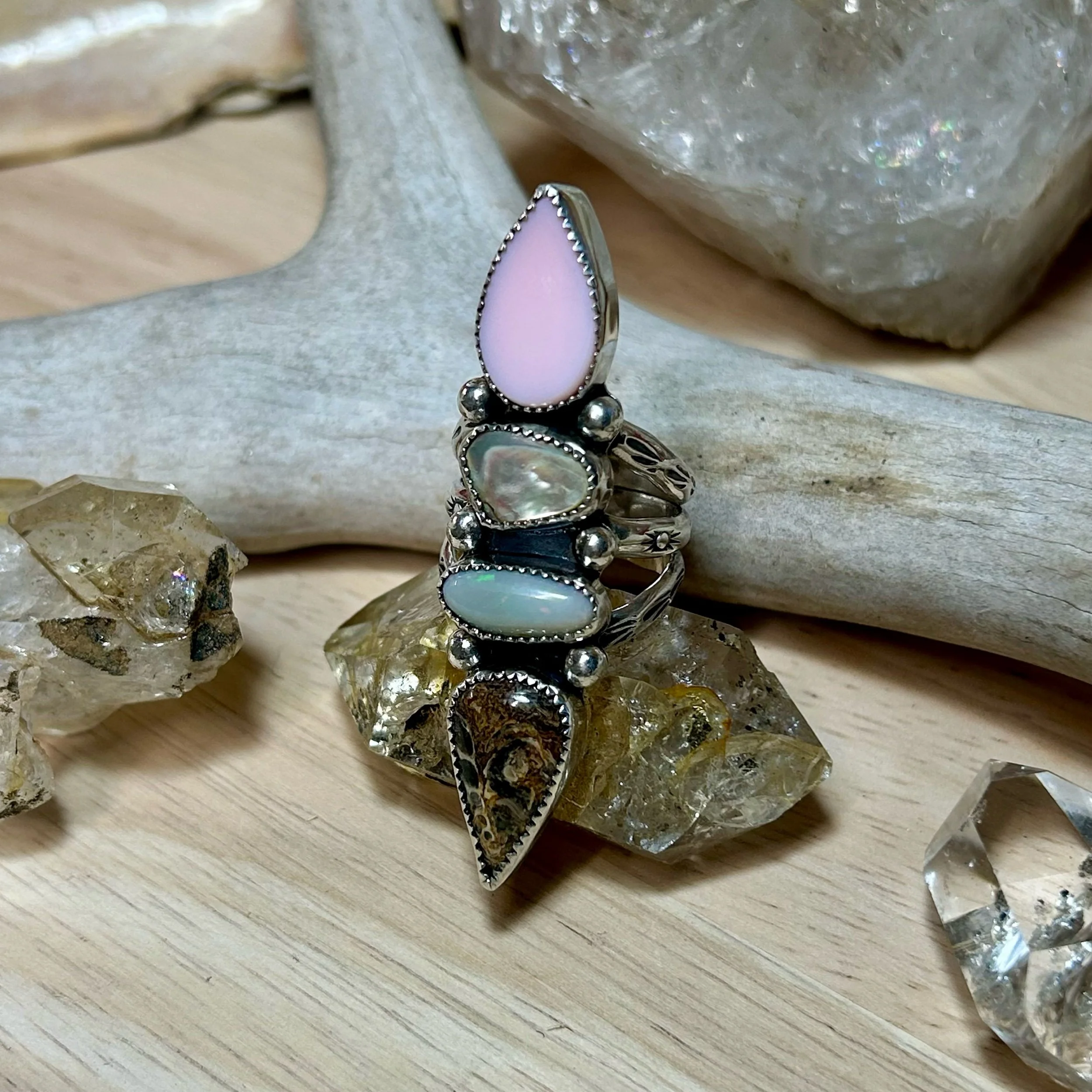 This gorgeous ring is entirely handcrafted out of sterling silver. It features a handcut piece of Bahamian Queen Conch Shell, a Fiery Australian Opal, Abalone Shell, and a fossilized shell stone. All are set in serrated bezel and flanked by silver ball details. The ring band is a triple shank with stamped sun details. It fits a size 8.5.