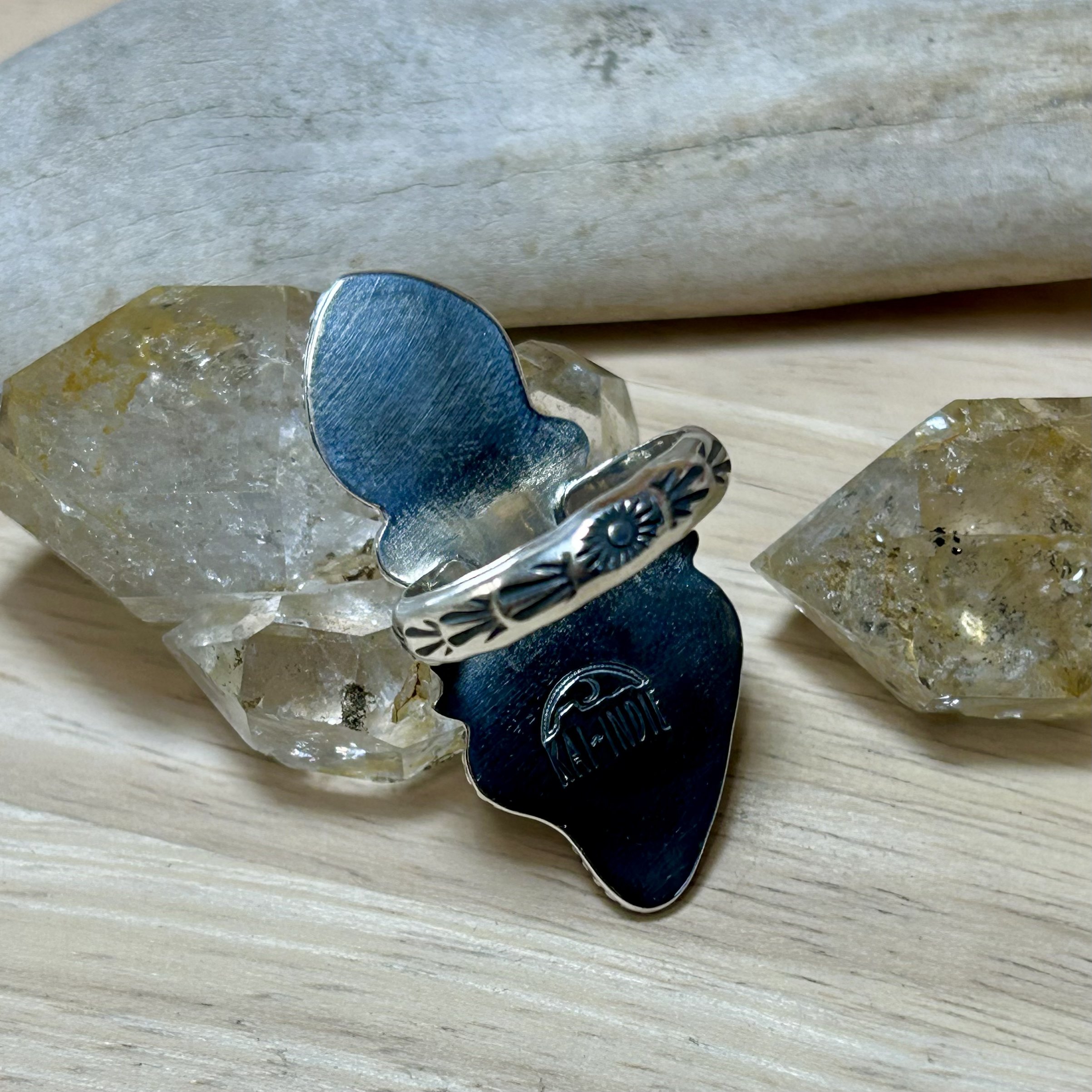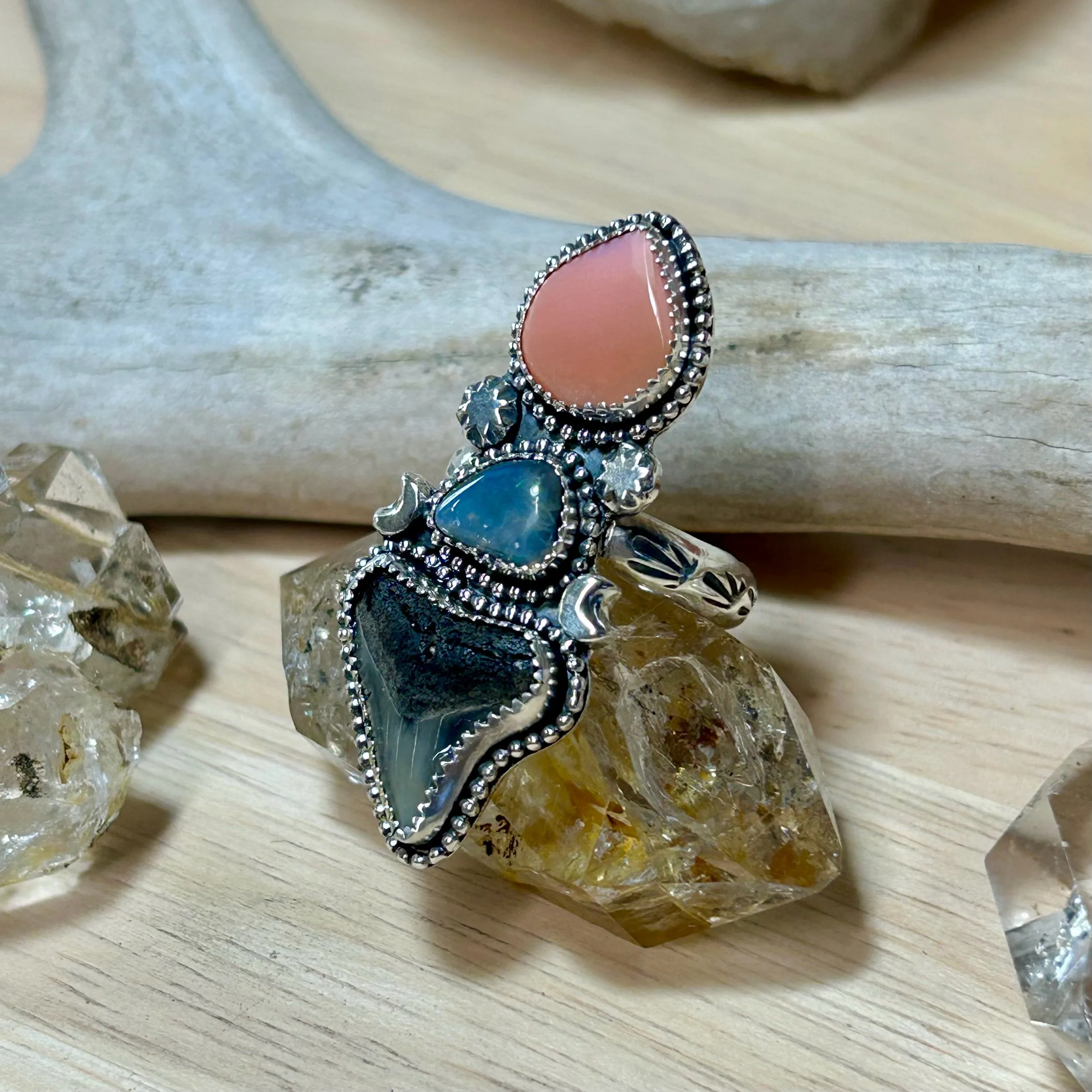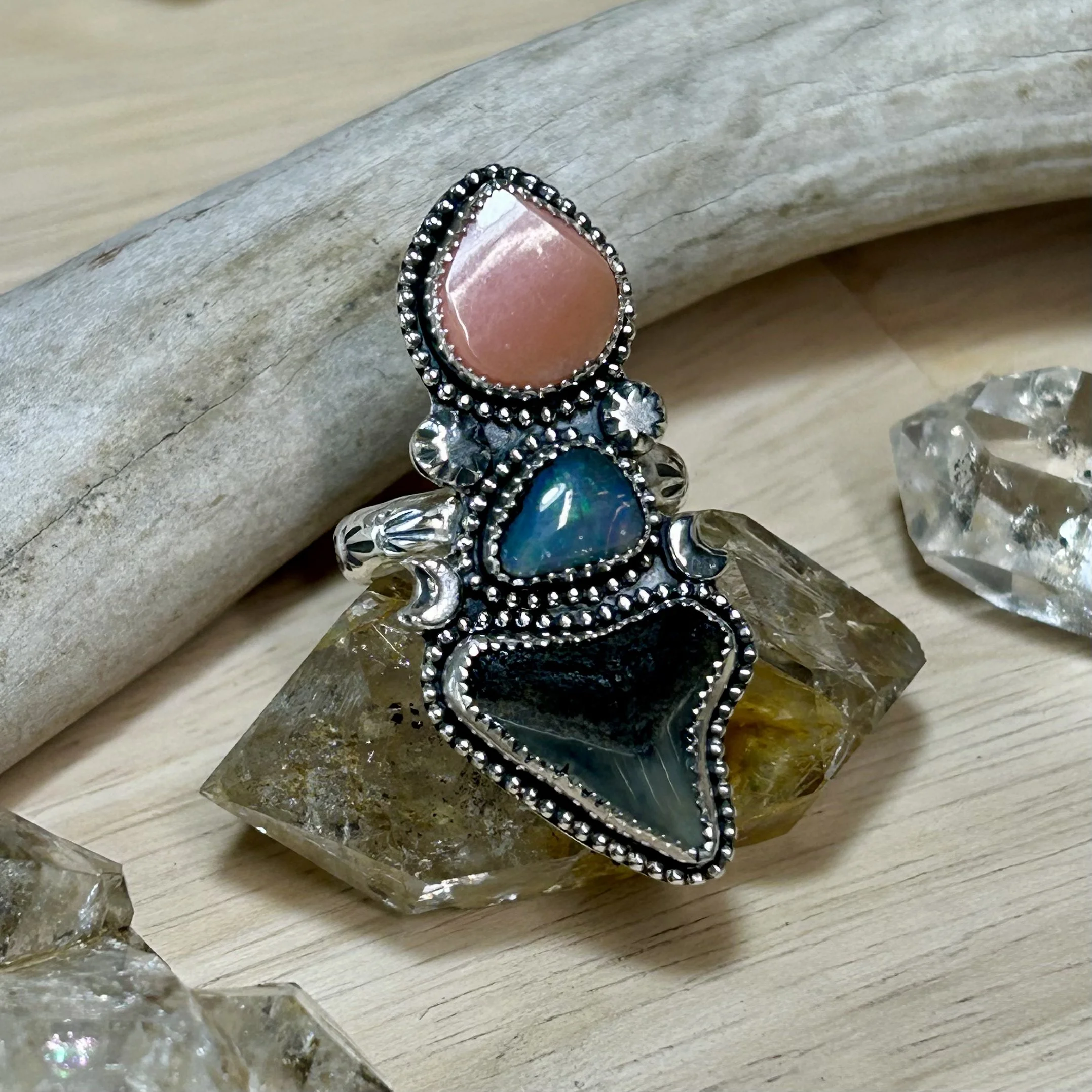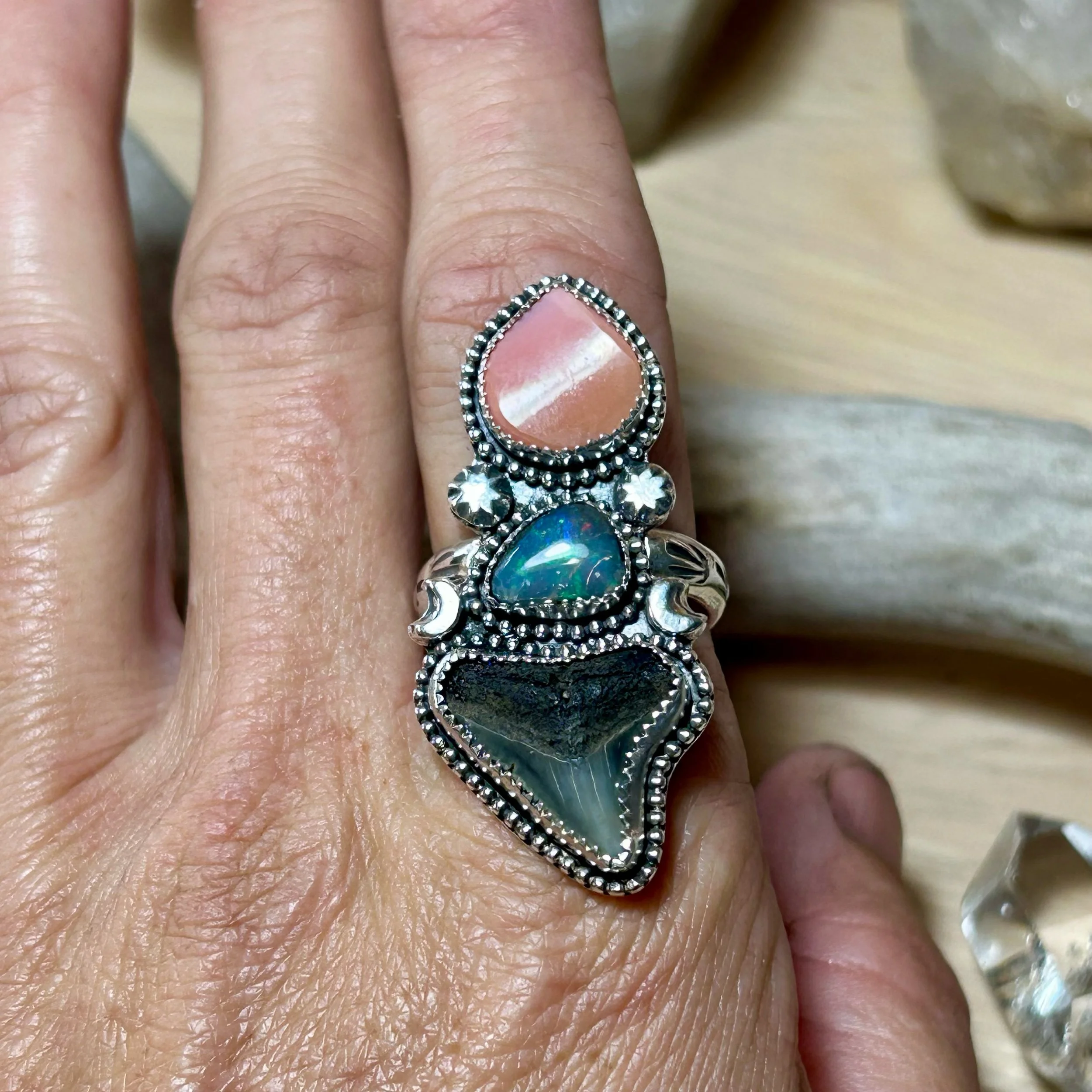 This stunning ring is entirely handcrafted out of sterling silver. It features a handcut Bahamian Queen Conch Shell, a fiery Australian Opal and a fossilized Shark Tooth. All are set in serrated bezels, surrounded by beaded borders and flanked by silver stars and moon details. The band has a unique stamped motif and fits a size 10.