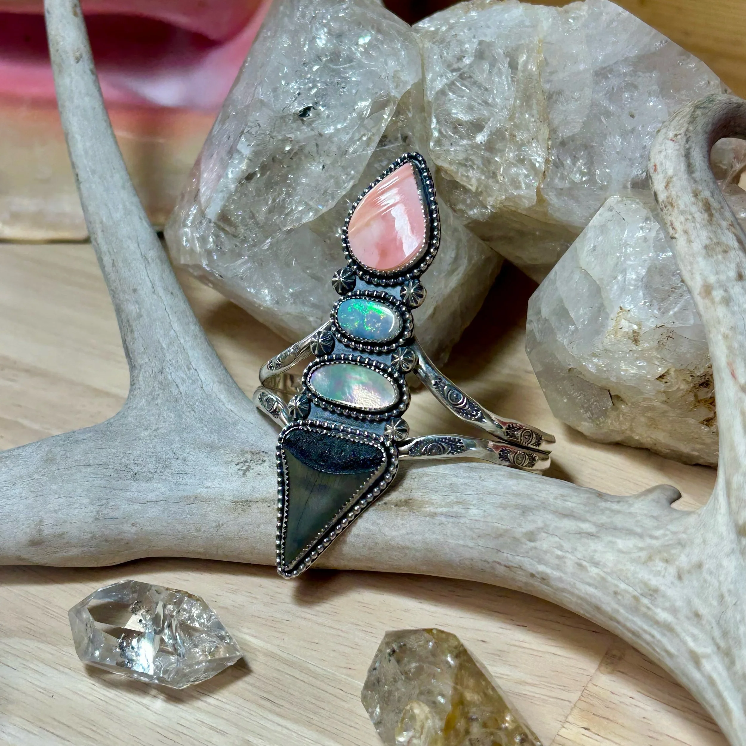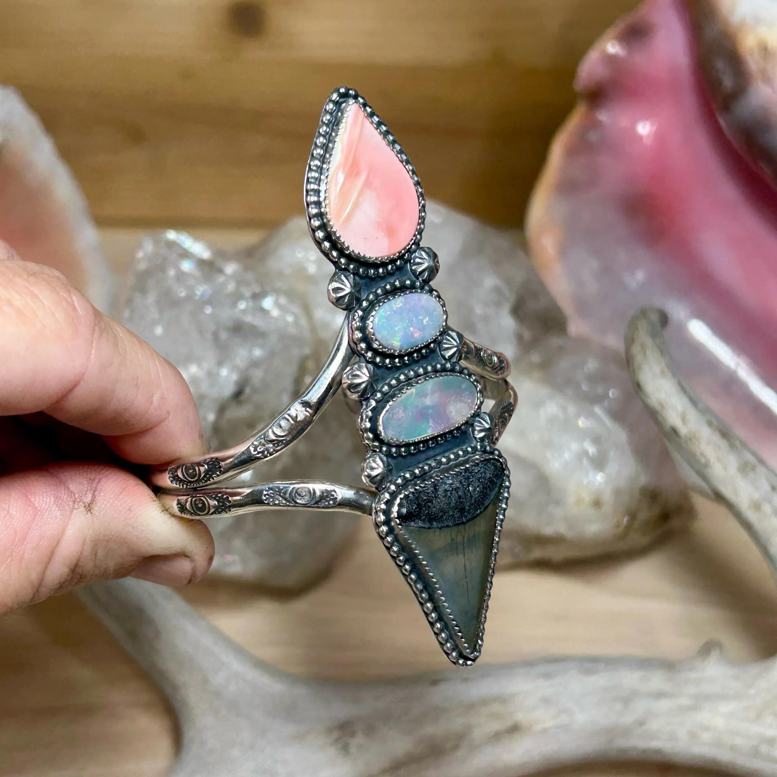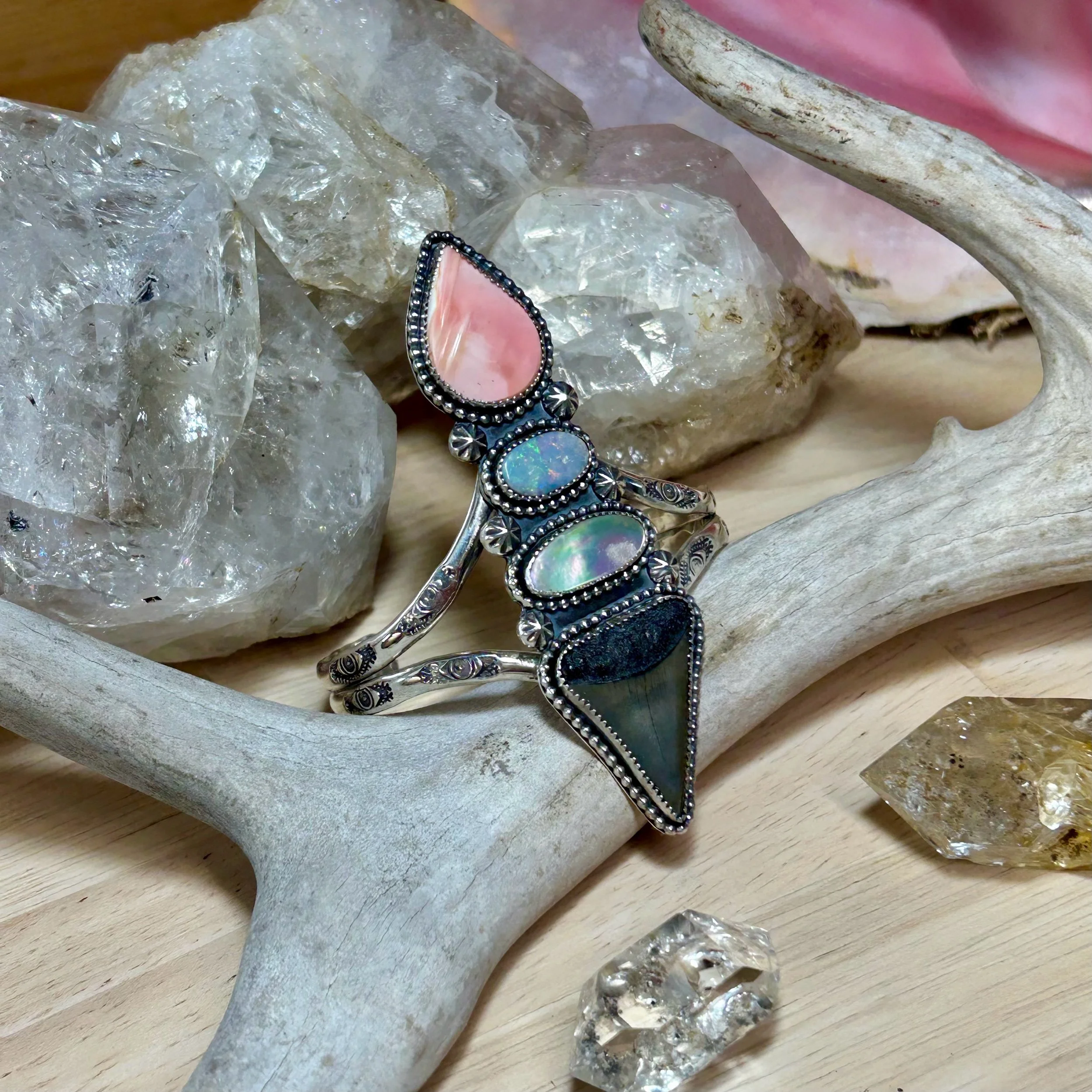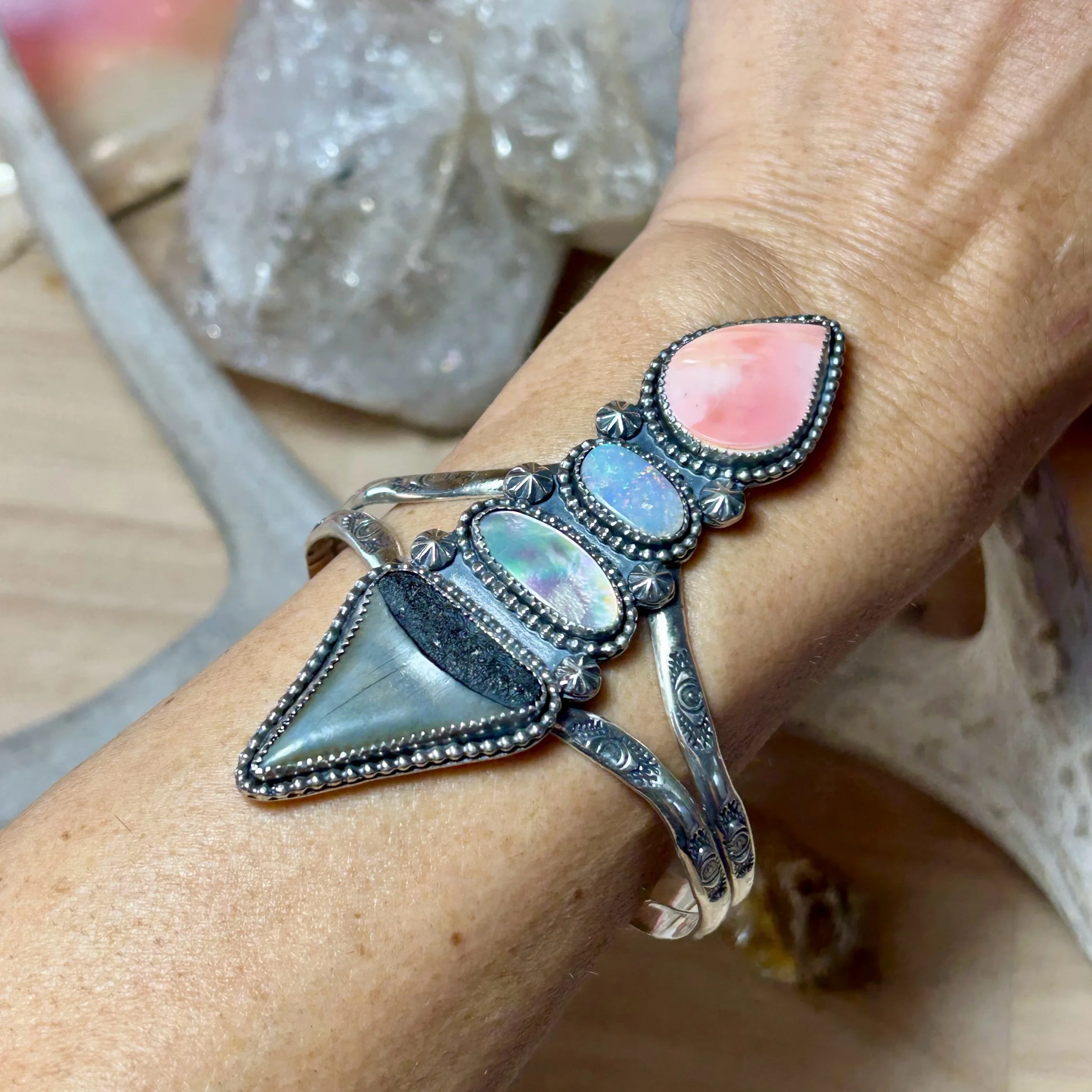 This stunning cuff is completely handcrafted out of sterling silver. It features a handcut piece of Bahamian Queen Conch, a firey Australian Opal, Abalone and a Fossilized Shark Tooth. All are set in serrated bezels and surrounded by a beaded border with silver concha star details. The band is stamped with unique details. The cuff is slightly adjustable measuring 5.75” in length and fitting a medium to large wrist the best.