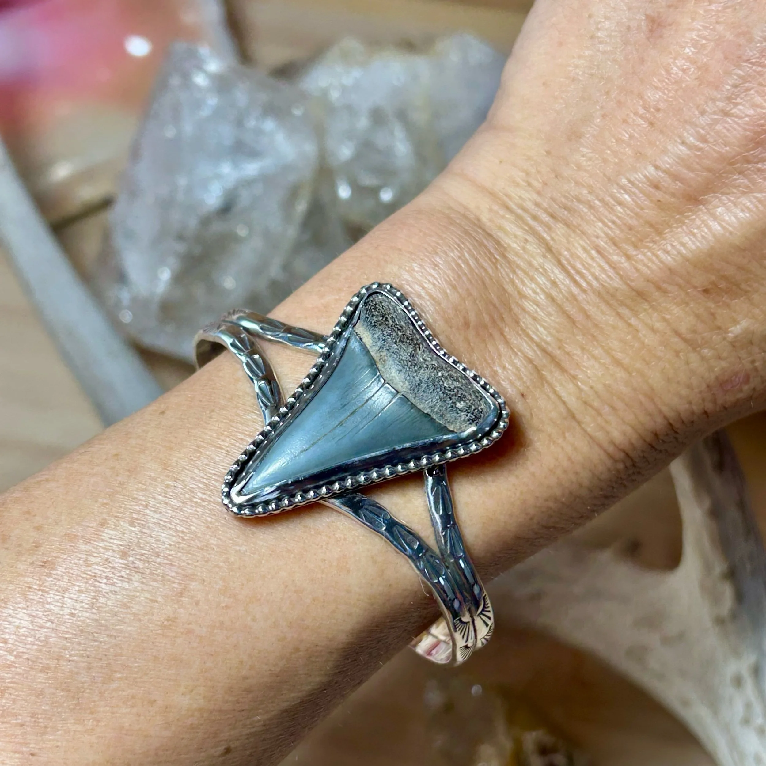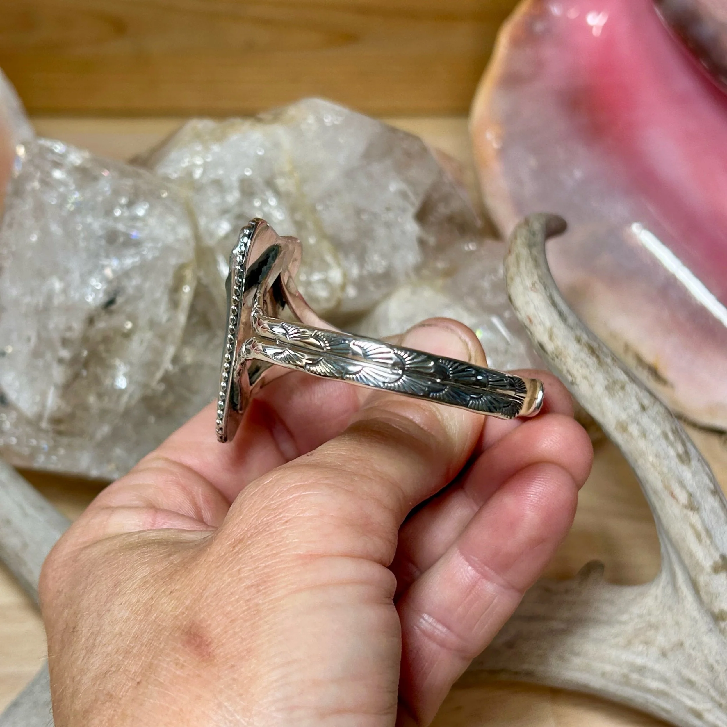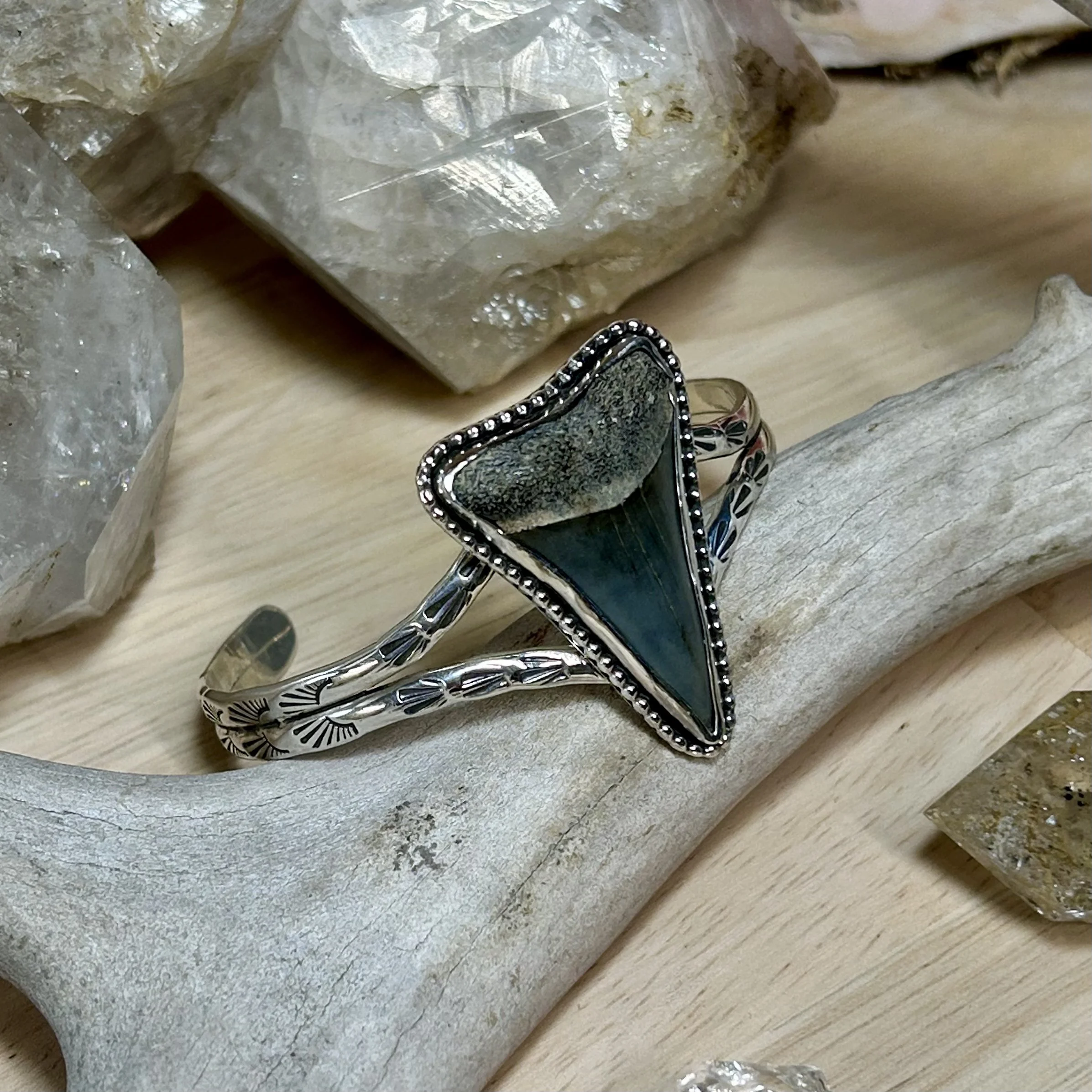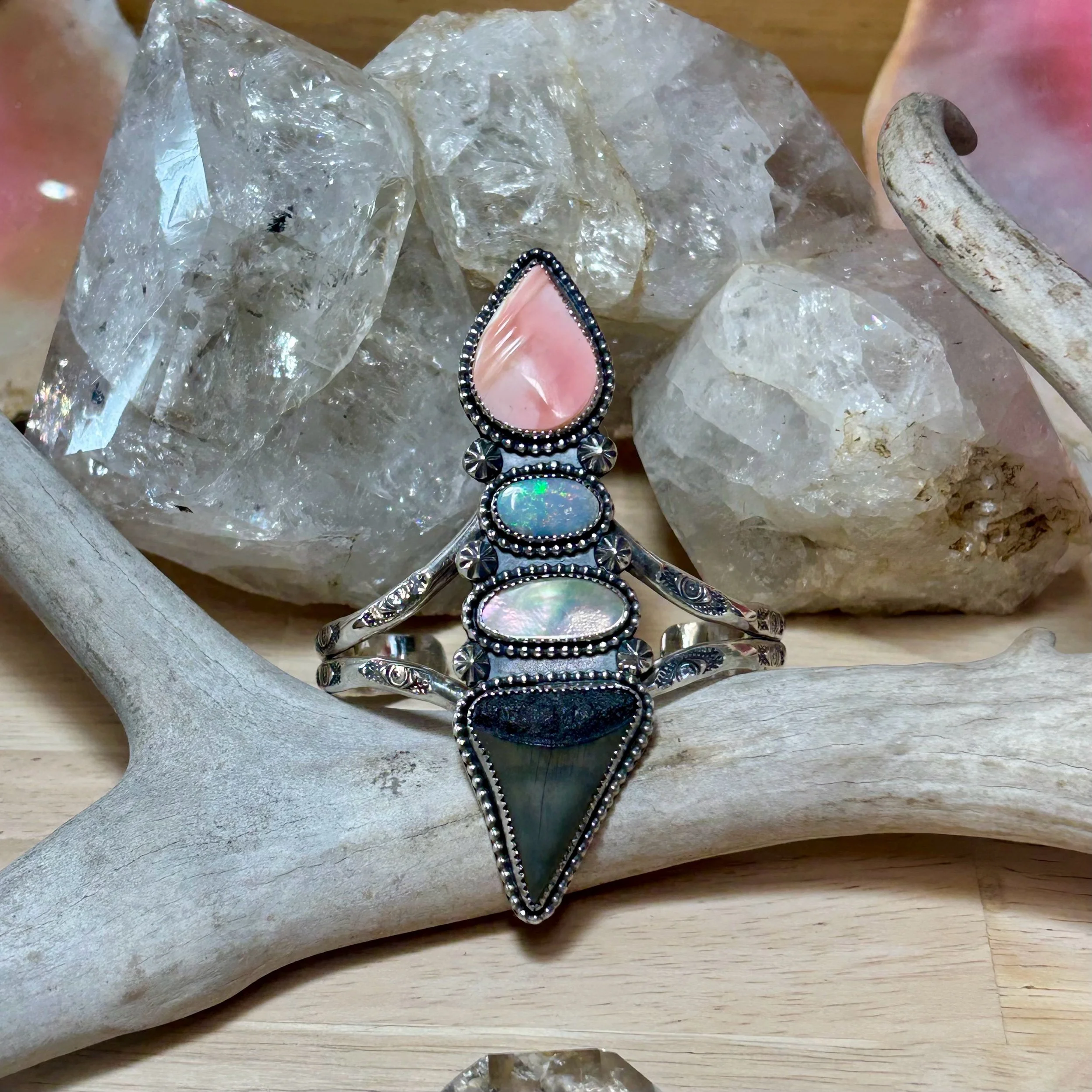 This stunning cuff is completely handcrafted out of sterling silver. It features a handcut piece of Bahamian Queen Conch, a firey Australian Opal, Abalone and a Fossilized Shark Tooth. All are set in serrated bezels and surrounded by a beaded border with silver concha star details. The band is stamped with unique details. The cuff is slightly adjustable measuring 5.75” in length and fitting a medium to large wrist the best.