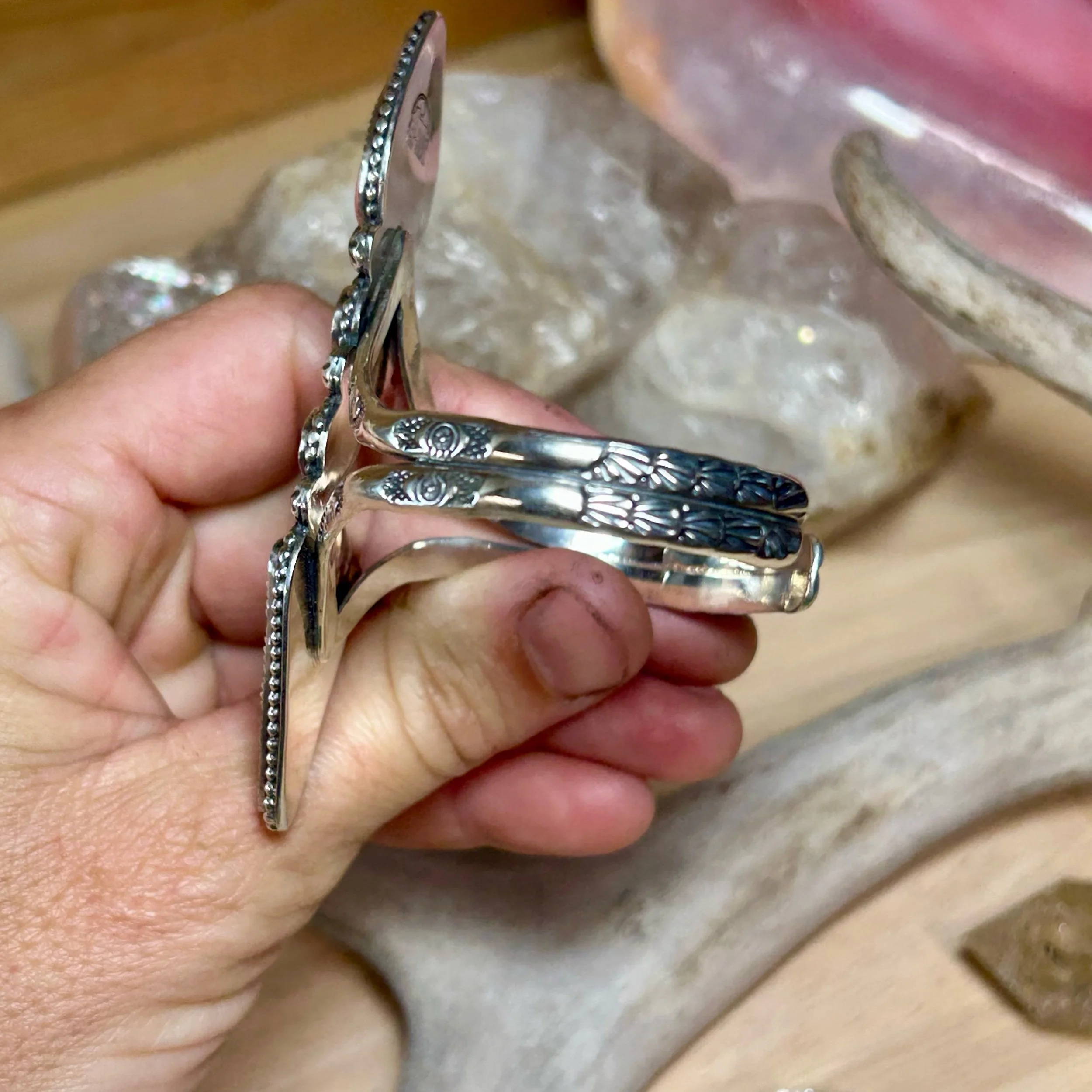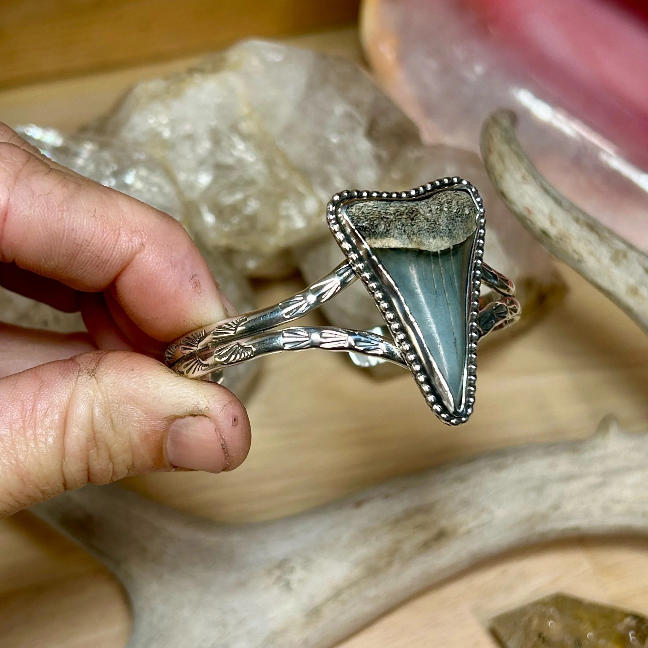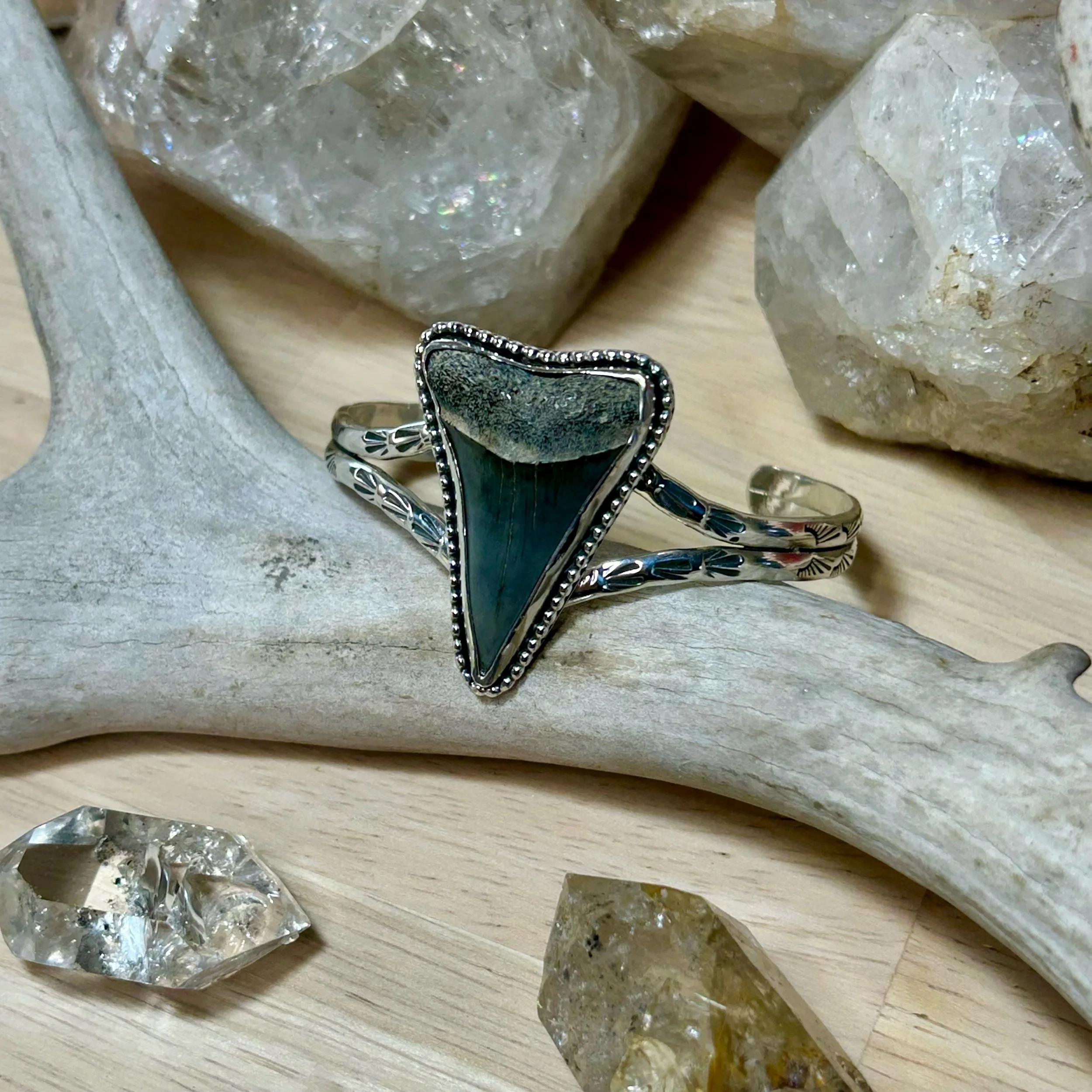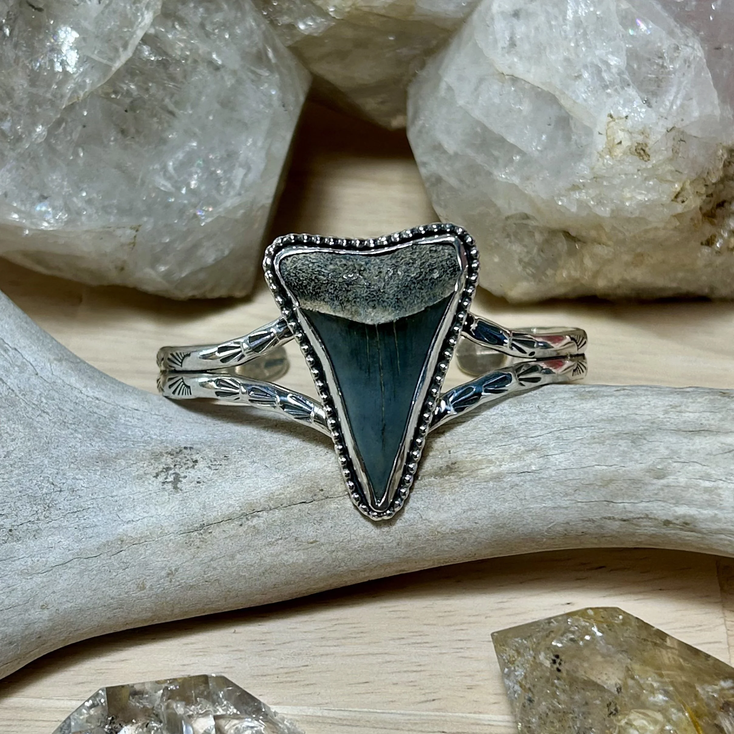 This stunning cuff is completely handcrafted out of sterling silver. It features a handcut piece of Bahamian Queen Conch, a firey Australian Opal, Abalone and a Fossilized Shark Tooth. All are set in serrated bezels and surrounded by a beaded border with silver concha star details. The band is stamped with unique details. The cuff is slightly adjustable measuring 5.75” in length and fitting a medium to large wrist the best.